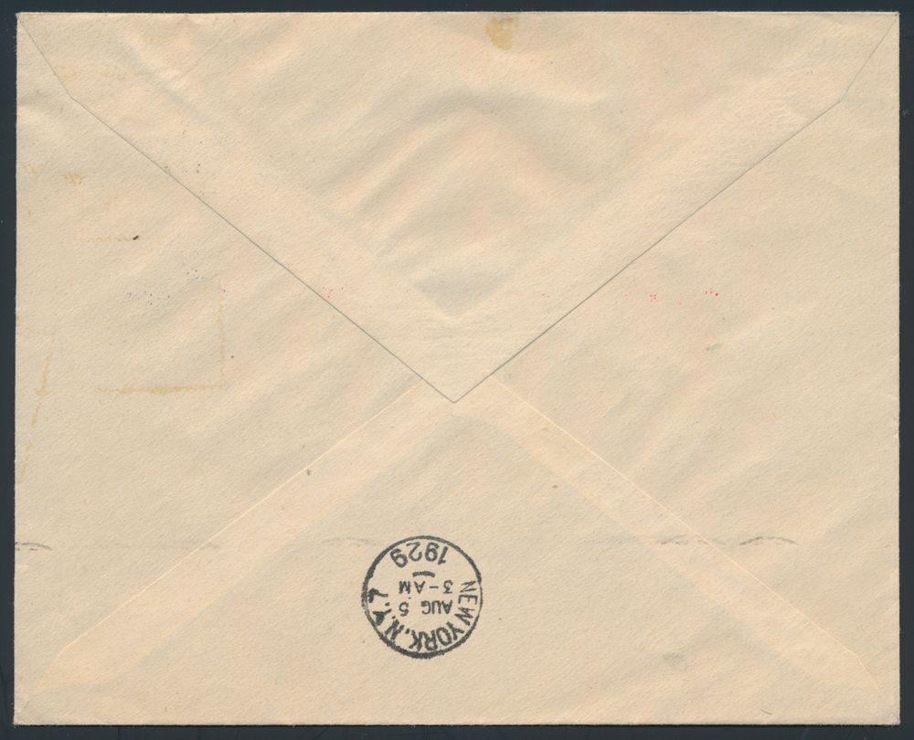 4248 image15.5.1929 N° 23a (Mi. Zeppelin Specialised), LZ 127 Amerikafahrt cover sent to Bayonne, New Jersey and franked with a 4 RM stamp (Michel 424) tied by Friedrichshafen c.d.s., zeppelin flight cachet in blue alongside as well as as single-line handstamp in red applied when the airship had to do an emergency landing in Cuers (thus delaying the delivery), arrival postmark on back, vertical fold far away from the stamp, vf(Image 1) (Image 2)