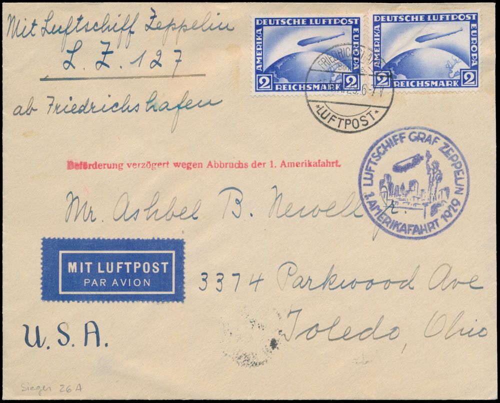 4246 image15.5.1929 N° 23a (Mi. Zeppelin Specialised), LZ 127 Amerikafahrt cover sent to Toledo, Ohio and franked with two singles of the 2 RM stamp (Michel 423) tied by a strike of the Friedrichshafen c.d.s., zeppelin flight cachet in blue alongside as well as as single-line handstamp in red applied when the airship had to do an emergency landing in Cuers (thus delaying the delivery), arrival postmark on back, faint crease on the right stamp otherwise very fine, vf(Image 1) (Image 2)