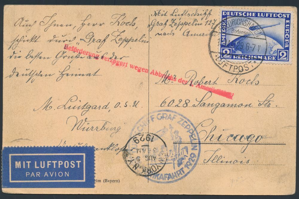 4245 image16.5.1929 N° 23a (Mi. Zeppelin Specialised), LZ 127 Amerikafahrt picture postcard sent to Chicago and bearing a 2 RM stamp (Michel 423) tied by Friedrichshafen c.d.s., zeppelin flight cachet in blue alongside, as well as single-line handstamp in red applied when the airship had to do an emergency landing in Cuers (thus delaying the delivery) and arrival postmark, vf/f(Image 1) (Image 2)