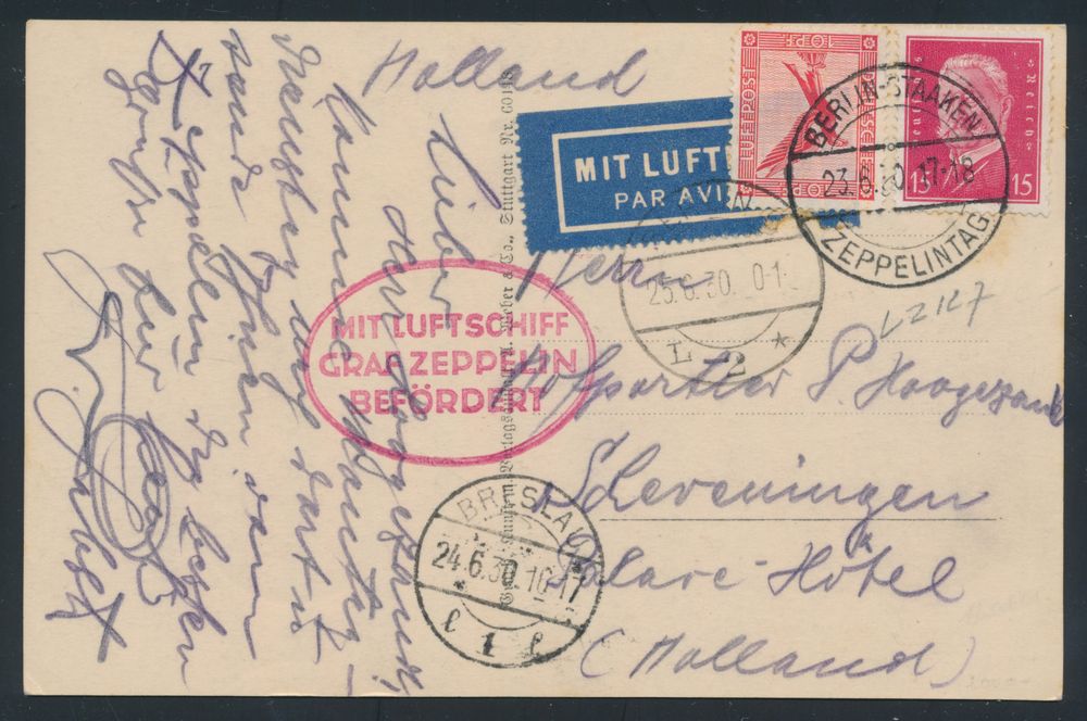 4258 image23.6.1930 N° 80Ia (Mi. Zeppelin Specialised), LZ 127 German Roundtrip Flight - Breslau drop-off photo postcard sent from Berlin to Scheveningen, Netherlands and franked for 25pf, oval auxiliary zeppelin handstamp "MIT LUFTSHIFF GRAF ZEPPELIN BEFÖRDERT" in red as well as Breslau c.d.s. and Berlin transit postmark dated 25.6 on the way to the Netherlands, vf(Image 1) (Image 2)