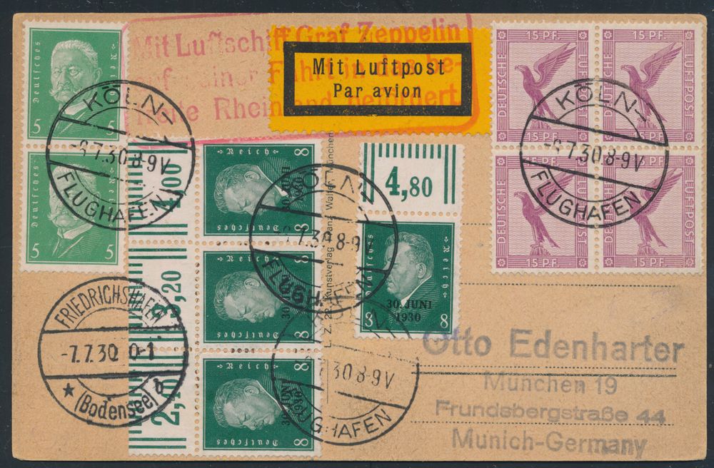 4259 image6.7.1930 N° 88a (Mi. Zeppelin Specialised), LZ 127 Köln - Friedrichshafen Flight picture postcard addressed to Munich and displaying a colourful franking consisting of both airmail and normal stamps, zeppelin flight cachet in red, nice promotional image on the front including various elements hinting at philately, vf(Image 1) (Image 2)