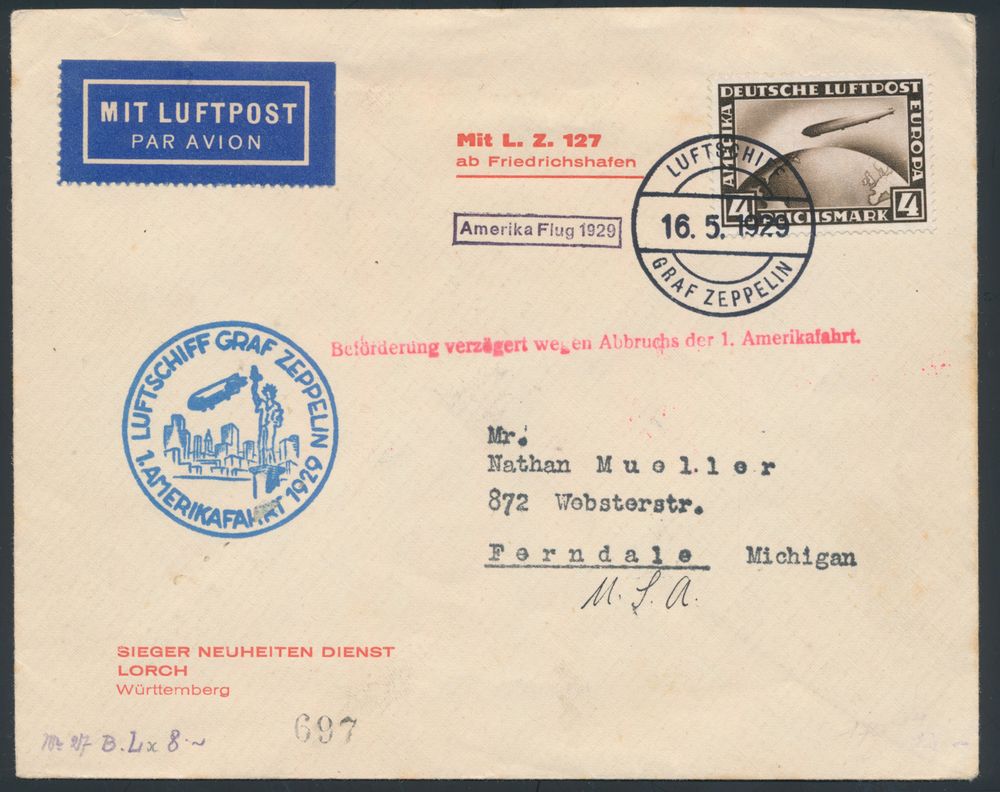 4247 image16.5.1929 N° 23b (Mi. Zeppelin Specialised), LZ 127 Amerikafahrt cover to Ferndale, Michigan bearing a 4 RM stamp (Michel 424) tied by Bordpost cancel, zeppelin flight cachet in blue alongside, as well as carmine single-line handstamp applied when the airship had to do an emergency landing in Cuers (thus delaying the delivery), arrival c.d.s. on reverse, vf(Image 1) (Image 2)