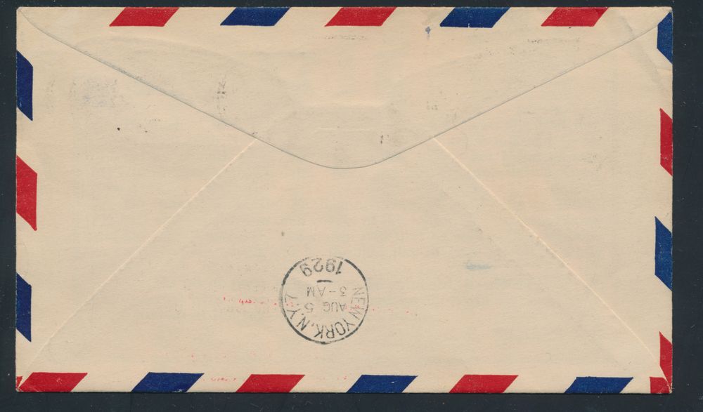 4243 image15.5.1929 N° 23a (Mi. Zeppelin Specialised), LZ 127 Amerikafahrt postcard to New York bearing a 2 RM stamp (Michel 423) tied by Friedrichshafen cancel, zeppelin flight cachet in blue alongside, as well as carmine single-line handstamp applied when the airship had to do an emergency landing in Cuers (thus delaying the delivery), arrival c.d.s. also on the front, relatively minor water damage but still of pleasant aspect, vf(Image 1) (Image 2)