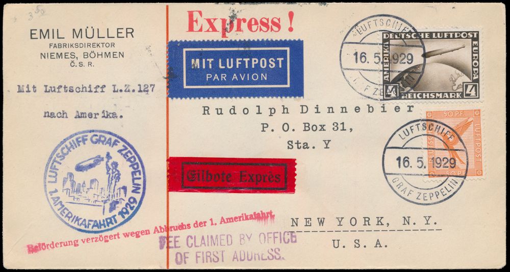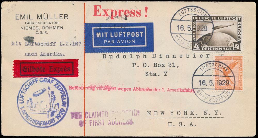 4241 image16.5.1929 N° 23b (Mi. Zeppelin Specialised), LZ 127 Amerikafahrt express cover to New York franked with a 4 RM stamp (Michel 424) as well as another 50pf stamp, both tied by Bordpost cancel, zeppelin flight cachet in blue alongside, as well as single-line handstamp in red applied when the airship had to do an emergency landing in Cuers (thus delaying the delivery), American "FEE CLAIMED BY OFFICE OF FIRST ADDRESS" double-line handstamp applied on the front on arrival, indicating that the cover got taxed before delivery (also backed by the two New York postmarks on the back with different dates), overall uncommon, vf(Image 1) (Image 2)