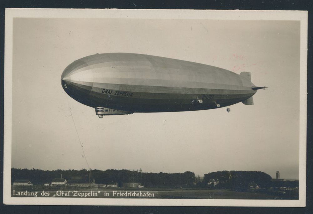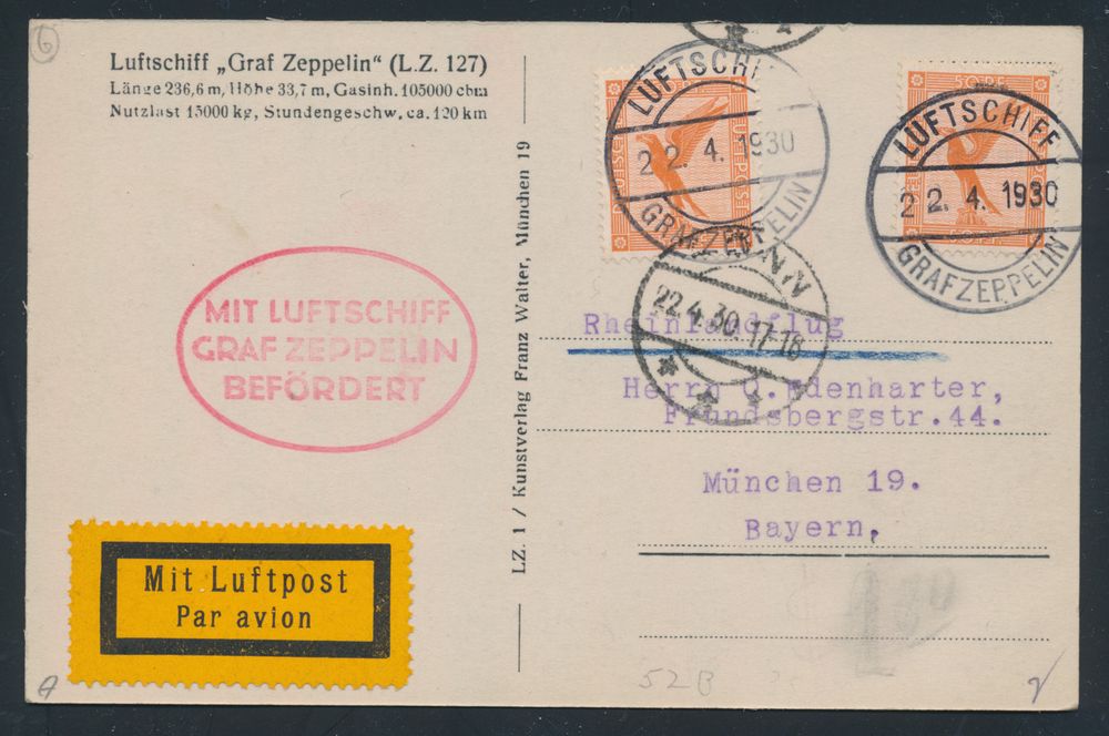 4255 image22.4.1930 N° 56b (Mi. Zeppelin Specialised), LZ 127 Bonn Flight photo postcard addressed to Munich and bearing two 50pf airmail stamps (Michel 381) both tied by Bordpost cancels, oval auxiliary zeppelin handstamp "MIT LUFTSHIFF GRAF ZEPPELIN BEFÖRDERT" in red alongside, as well as Bonn arrival c.d.s. dated the same day, vf(Image 1) (Image 2)