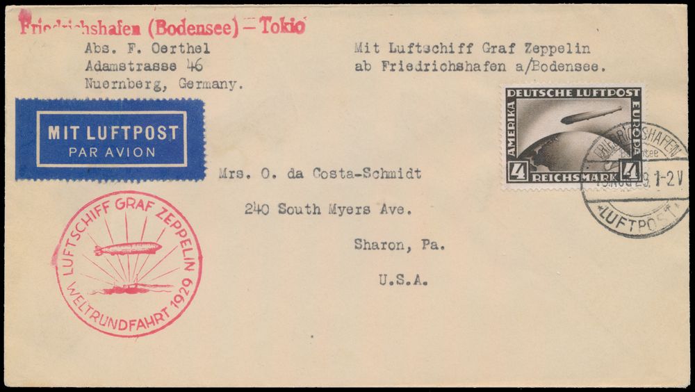 4251 image15.8.1929 N° 29a (Mi. Zeppelin Specialised), LZ 127 Round the World Flight cover to the US bearing a 4 RM stamp (Michel 424) tied by Friedrichshafen c.d.s., carmine zeppelin flight cachet alongside, as well as single-line handstamp "Friedrichshafen (Bodensee) - Tokio", vf(Image 1) (Image 2)