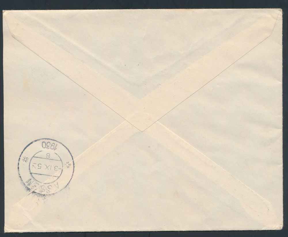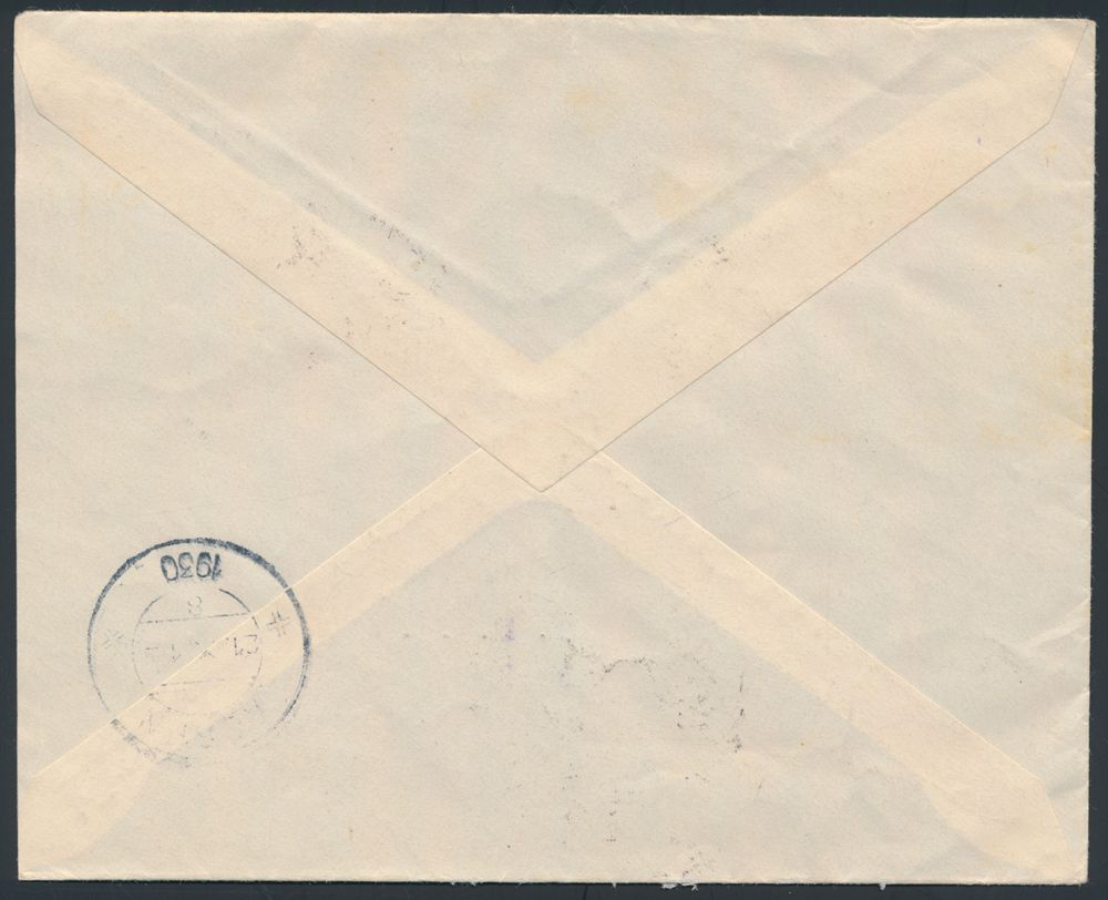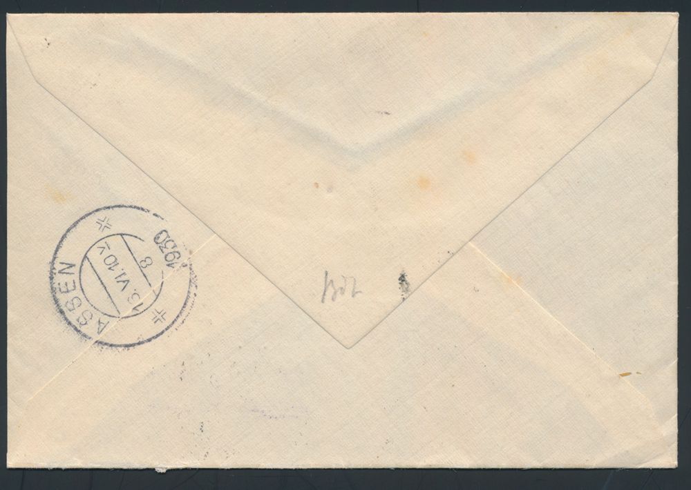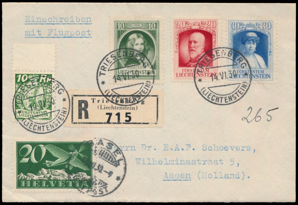 4310 image14.6.1930 airmail cover sent registered from Triesenberg to Assen, Netherlands and showing a mixed franking with Swiss stamps, which was compulsory on airmail covers from Liechtenstein until 12.8.1930 because Liechtenstein didn't have any airmail stamps of its own, the Swiss stamp was applied in Basel in this case, Dutch arrival c.d.s. on the back, great quality, vf(Image 1) (Image 2)