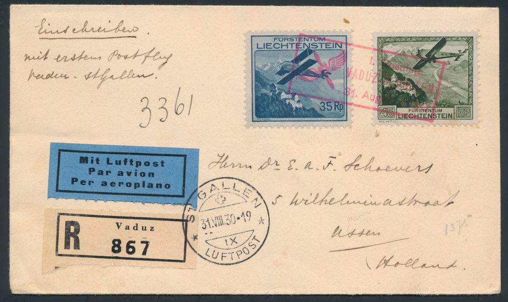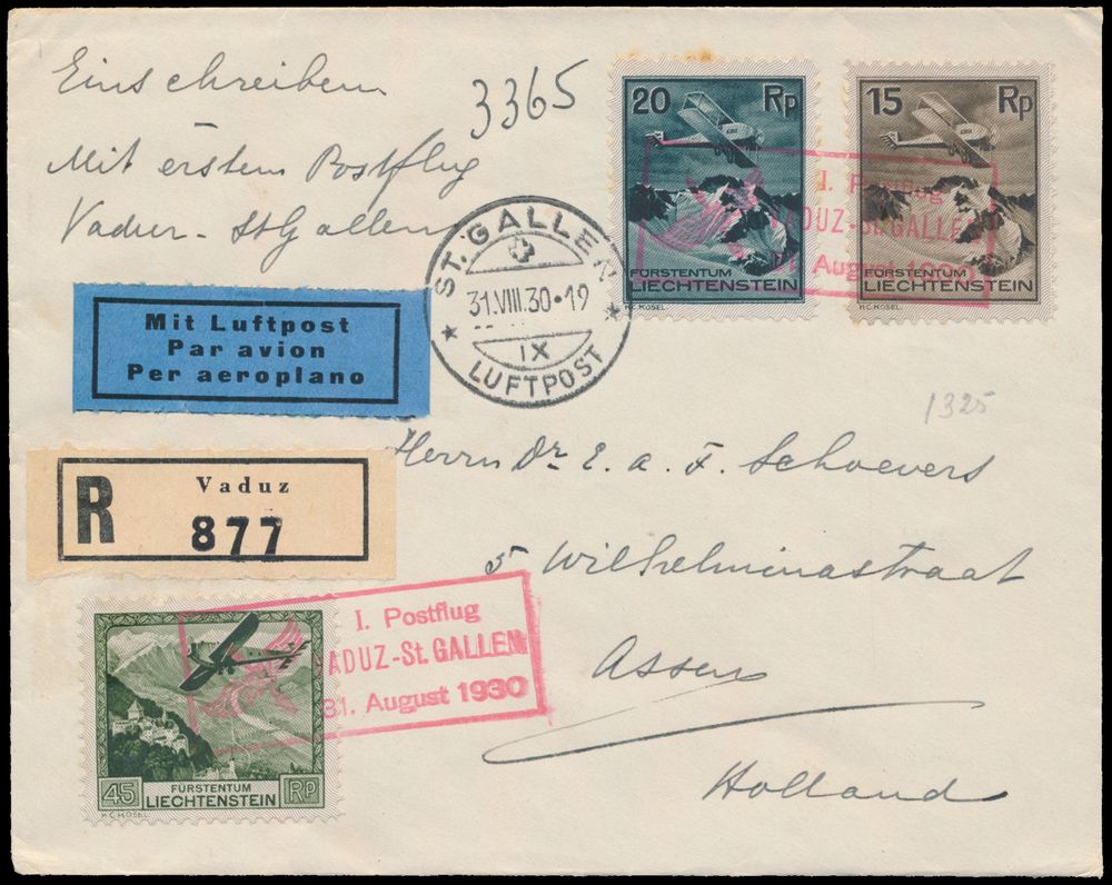 4313 image31.8.1930 Vaduz - St. Gallen First Flight registered cover sent from Vaduz to Assen, Netherlands and franked with 35rp and 45rp stamps of the 1930 airmail issue (Michel 111-112, cat. value for the 45rp on cover is €130), all tied by special flight cachet in lilac-rose, St. Gallen landing postmark on the front and Dutch arrival c.d.s. on the back, vf(Image 1) (Image 2)