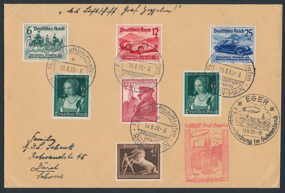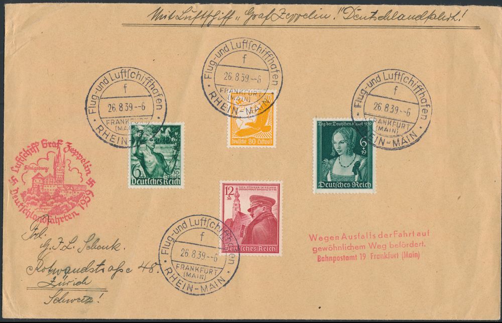 4303 image26.8.1939 N° 31 (Mi. Zeppelin Specialised), LZ 130 Final Flight cover addressed to Zürich, Switzerland and franked with four different stamps including the 1939 German Art Day (Michel 700), all tied by Frankfurt special postmark, zeppelin flight cachet alongside in red, an interesting document of historical value, as it was carried on board the last ever commercial flight of a zeppelin airship before WWII, vf(Image 1) (Image 2)