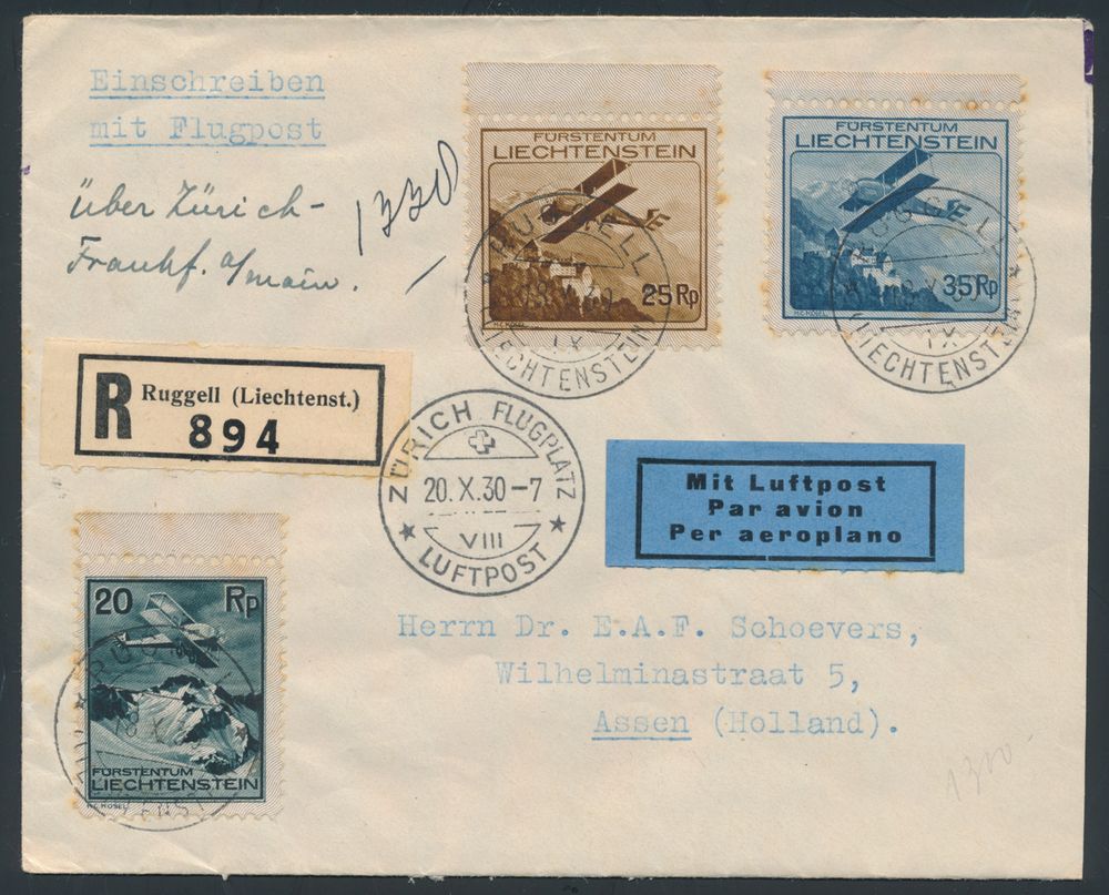 4314 image18.10.1930 airmail cover sent registered from Ruggell to Assen, Netherlands and franked with the 20rp, 25rp and 35rp values of the 1930 airmial issue (Michel 109-111), Zürich transit postmark on the front and arrival postmark on the back, f(Image 1) (Image 2)