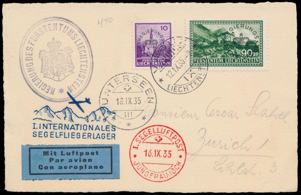 4318 image12.9.1935 N° 60g (Mi. Zeppelin Specialised), First Swiss International Glider Mail Flight - Jungfraujoch postcard sent from Vaduz and addressed to Zürich, dropped off at Unterseen and franked with OFFICIAL stamps of 10rp and 90rp (Michel Dienst 12 + 18, the cat. value for the 90rp on cover is €100), special flight cachet and postmark in blue and red respectively alongside, as well as an official seal of the Government of Liechtenstein in the upper left corner, rare, vf(Image 1) (Image 2)
