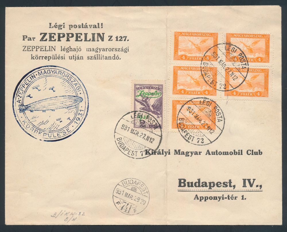 4305 image27.3.1931 N° 162Ab (Mi. Zeppelin Specialised), Hungarian Flight cover flown on the Budapest roundtrip and franked with a 2p zeppelin stamp (Michel 479) as well as an irregular block of five of 4f, zeppelin flight cachet in blue on the front and arrival c.d.s. of Budapest alongside, vertical file fold not affecting any of the stamps, vf(Image 1) (Image 2)
