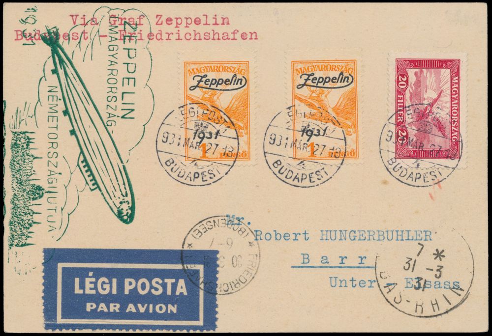4306 image27.3.1931 N° 163Aa (Mi. Zeppelin Specialised), LZ 127 Hungarian Flight postcard sent to Barr, France and franked with two singles of the Hungarian 1p zeppelin stamp (Michel 478) + another 20f airmail stamp, all tied by Budapest c.d.s., most decorative and neatly struck zeppelin flight cachet alongside in dark green, as well as Friedrichshafen landing postmark and, relatively uncommon for many such cards addressed to European destinations, an arrival c.d.s. (dated 31.3), vf(Image 1) (Image 2)