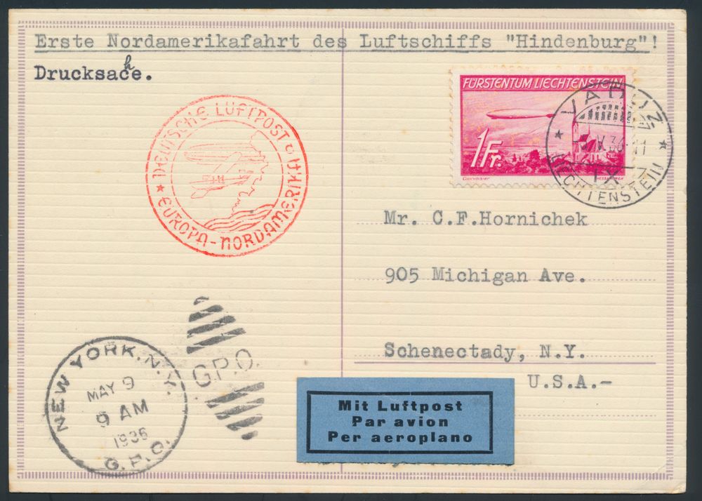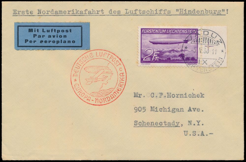4319 image5.5.1936 N° 12Aa (Mi. Zeppelin Specialised), LZ 129 North America Flight cover sent from Vaduz to Schenectady, New York and franked with a 1fr zeppelin stamp (Michel 149) tied by normal Vaduz c.d.s., zeppelin flight cachet in red and New York arrival postmark both on the front, vf(Image 1) (Image 2)