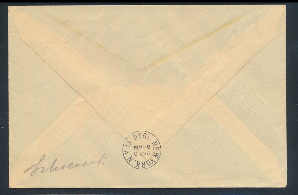 4320 image5.5.1936 N° 12Ab (Mi. Zeppelin Specialised), LZ 129 North America Flight cover sent from Vaduz to Schenectady, New York and franked with a 2fr zeppelin stamp (Michel 150) tied by normal Vaduz c.d.s., zeppelin flight cachet in red alongside on the front and New York arrival postmark on the back, vf(Image 1) (Image 2)