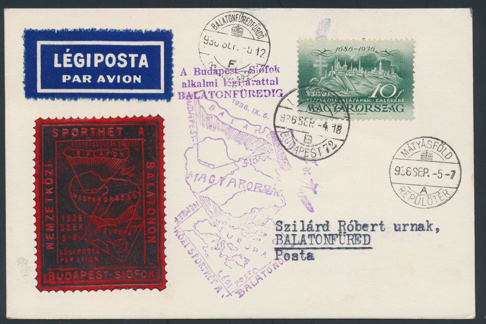 4309 image4.9.1936 Budapest - Siofok Flight postcard sent from Budapest to Balatonfüred and showing a large, high-quality vignette in the shape of a stamp (besides the normal 10f stamp it bears), special flight cachet in violet alongside, as well as transit and arrival postmarks, vf(Image 1) (Image 2)