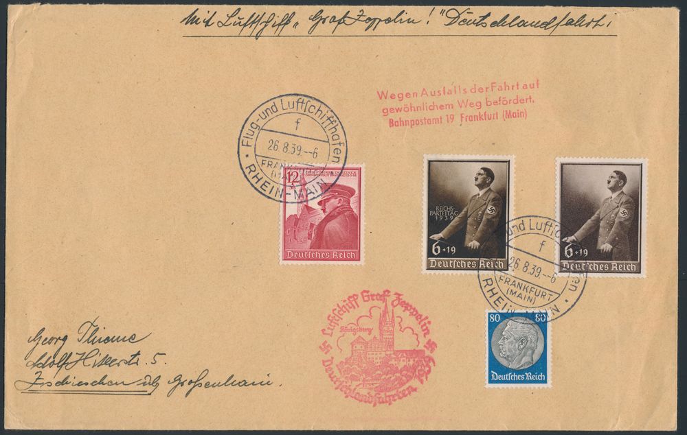 4302 image26.8.1939 N° 31 (Mi. Zeppelin Specialised), LZ 130 Final Flight cover franked with four different stamps including the 1939 Nürnberg Party Day (Michel 701), all tied by Frankfurt special postmark, zeppelin flight cachet alongside in red, an interesting document of historical value, as it was carried on board the last ever commercial flight of a zeppelin airship before WWII, vf(Image 1) (Image 2)