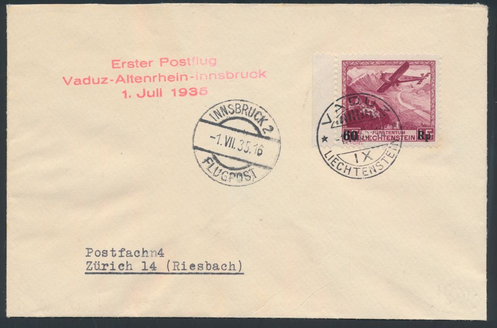 4317 image1.7.1935 N° 59 (Mi. Zeppelin Specialised), Vaduz-Altenrhein-Innsbruck First Postal Flight cover addressed to Zürich and franked with the 60rp on 1fr airmail stamp surcharged for this particular flight (Michel 148), special 3-line flight cachet in red and Innsbruck landing c.d.s. alongside on the front, vf(Image 1) (Image 2)