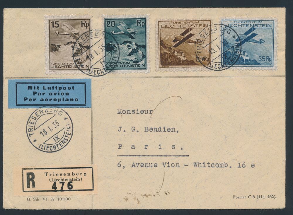 4316 image18.1.1935 airmail cover sent registered from Triesenberg to Paris and franked for 95rp with four values of the 1930 airmail issue (Michel 108-111), arrival c.d.s. on the back, vf(Image 1) (Image 2)