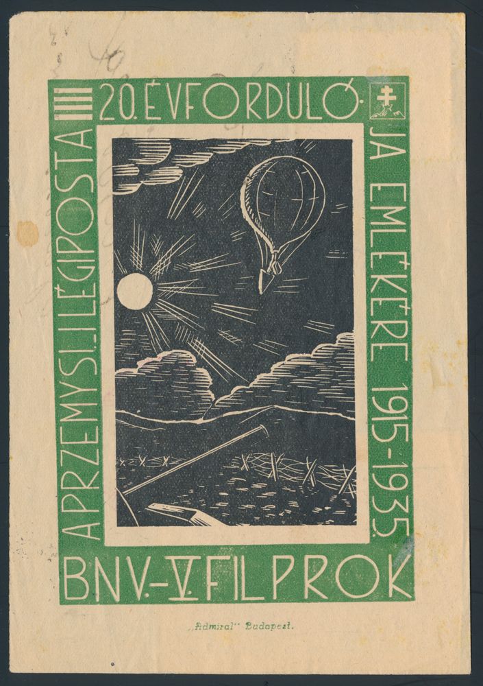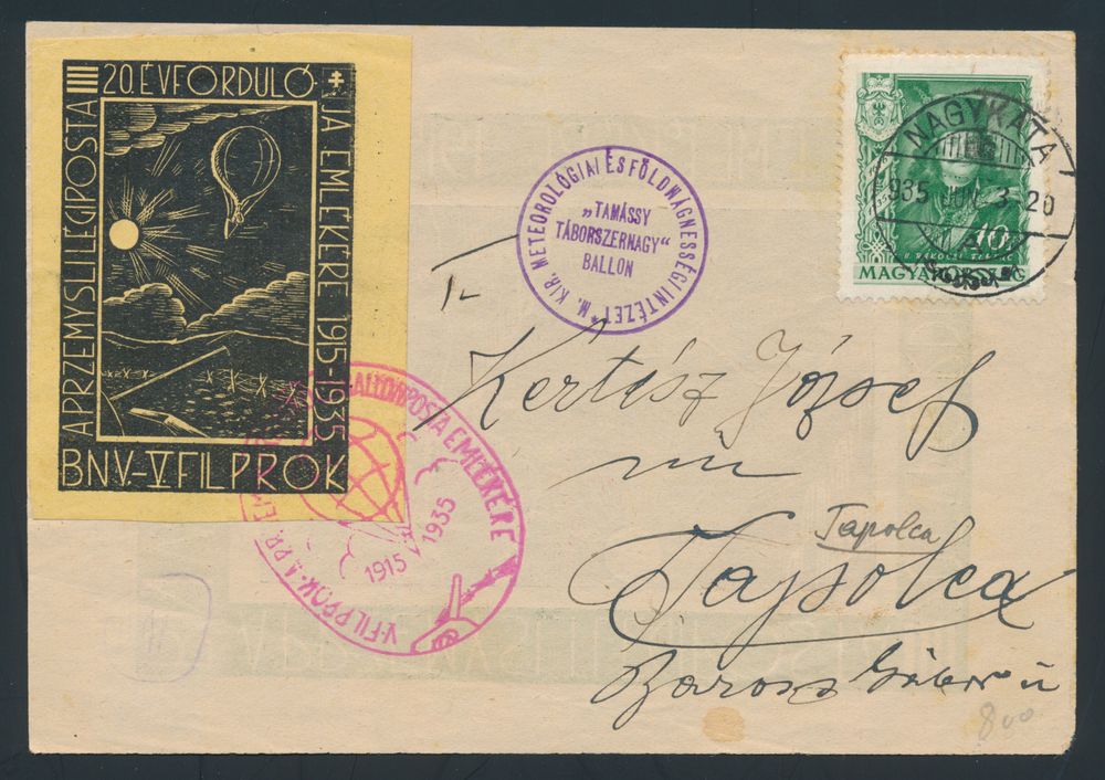 4307 image3.6.1935 FILPROK Philatelic Exhibition Balloon Post official postcard sent from Nagykata to Tapolca and bearing large vignette tied by flight cachet in rose, vf(Image 1) (Image 2)