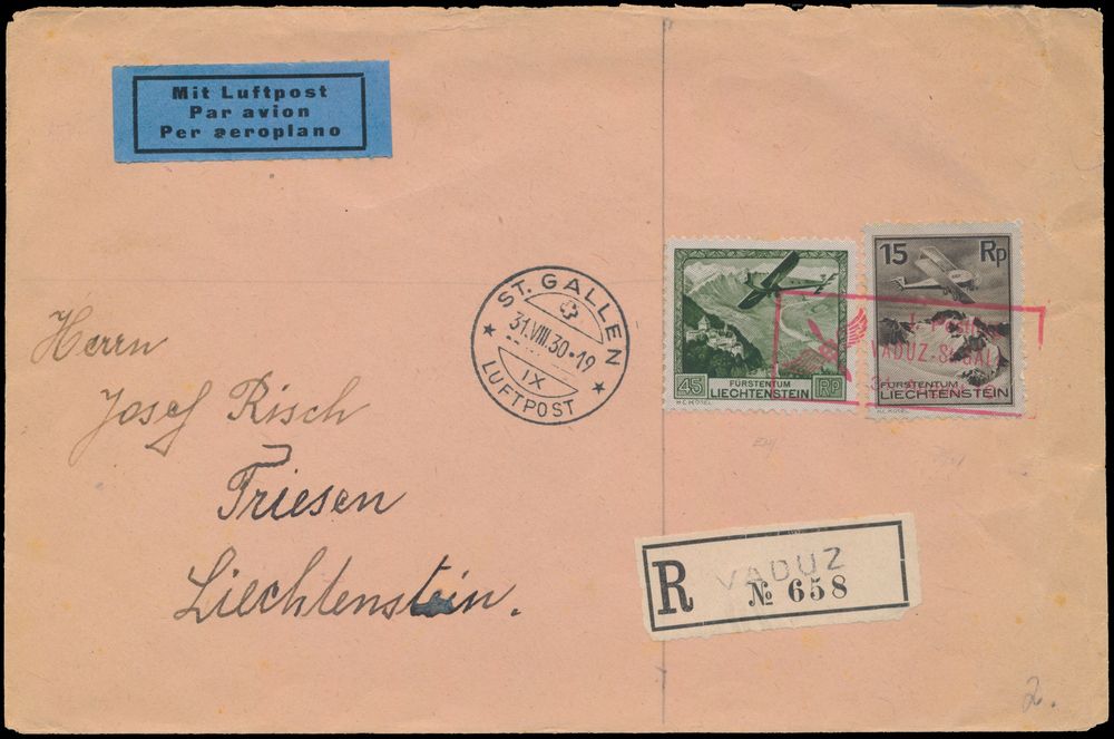 4311 image31.8.1930 N° 34a (Mi. Zeppelin Specialised), Vaduz - St. Gallen First Flight registered cover sent to Triesen, Liechtenstein and franked with 15rp and 45rp airmail stamps (Michel 108, 112, cat. value for the 45rp on cover is €130), both tied by special flight cachet in lilac-rose, Triesen arrival c.d.s. on the back, vf(Image 1) (Image 2)
