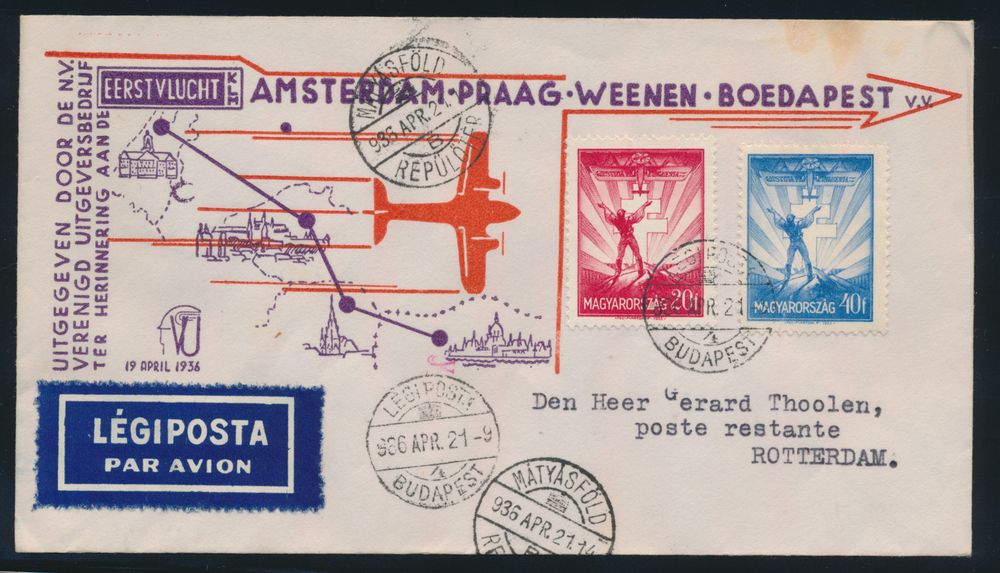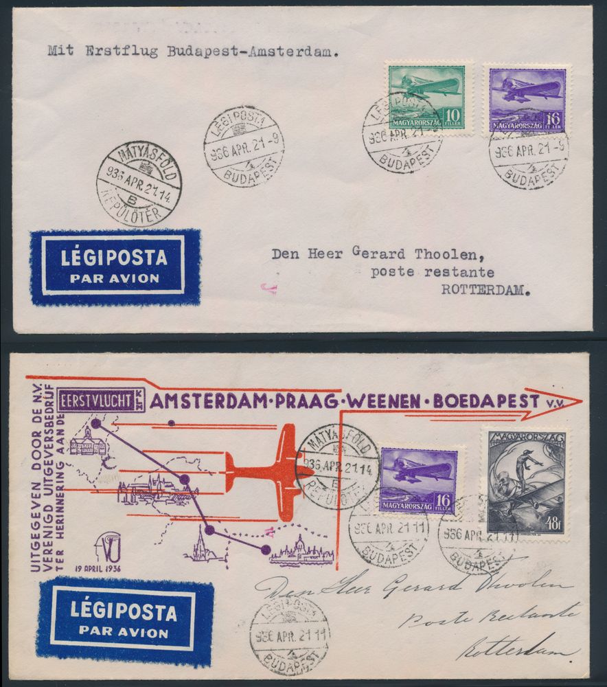 4308 image21.4.1936 Budapest - Amsterdam First Flight lot of 3 covers (two of which illustrated) addressed to Rotterdam, colourful airmail frankings, arrival postmarks on back, vf/f(Image 1) (Image 2)