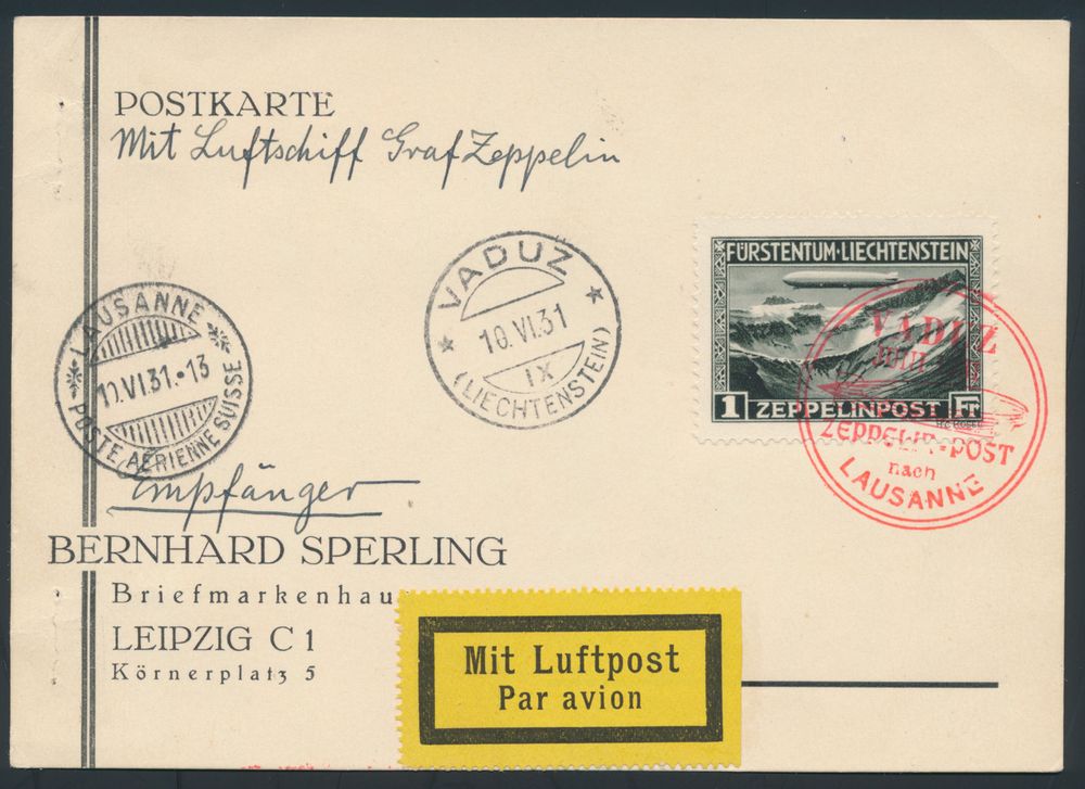 4315 image10.6.1931 N° 2a (Mi. Zeppelin Specialised), LZ 127 Vaduz - Lausanne Flight (drop-off) postcard addressed to Leipzig and franked with the 1fr zeppelin stamp (Michel 114) tied by zeppelin cachet in red, Vaduz c.d.s. alongside, as well as Lausanne landing postmark, cat. value for the flight is €160, vf(Image 1) (Image 2)