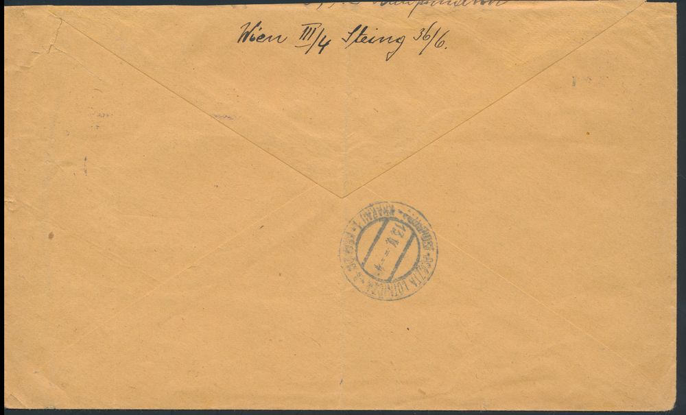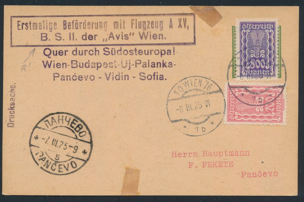 4330 image6.3.1925 Southern European First Flight of the A XV aircraft produced by the "Avis" Austrian aeroplane and automobile manufacturer, postcard sent from Vienna to Pancevo, Serbia, franked with regular postage stamps, flight cachet in violet as well as arrival c.d.s., uncommon, vf/f(Image 1) (Image 2)