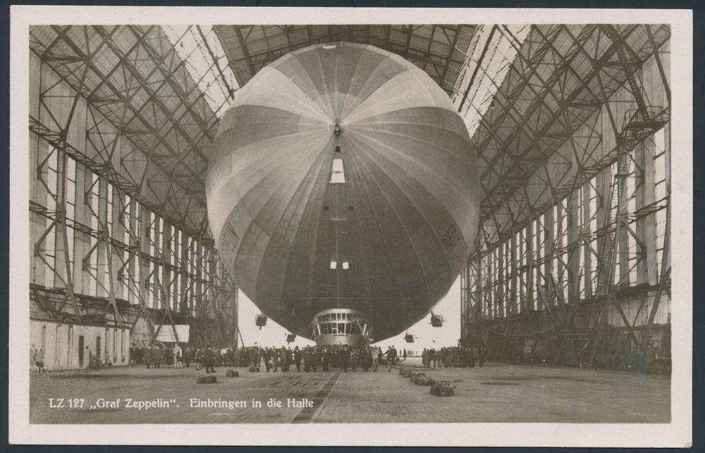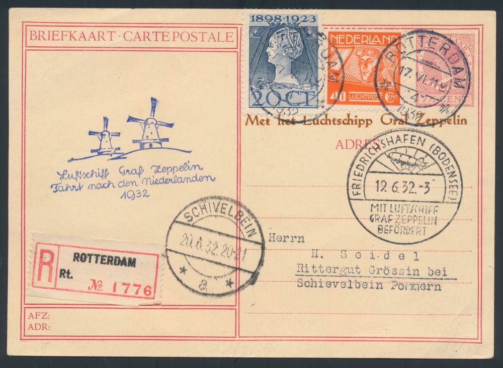 4326 image17.6.1932 N° 249Ab (Mi. Zeppelin Specialised), LZ 127 Netherlands Flight 7 1/2c picture postcard sent registered to Schivelbein, Pommerania (nowadays Świdwin, Poland) and up-rated with Dutch normal and airmail stamps all cancelled by Rotterdam postmarks, zeppelin flight cachet alongside in blue, as well as decorative Friedrichshafen landing postmark (handstamp type, scarcer than the machine type) and final arrival c.d.s., uncommon, vf(Image 1) (Image 2)