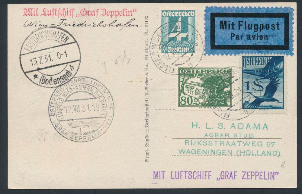 4333 image12.7.1931 N° 200c (Mi. Zeppelin Specialised), LZ 127 Austrian Flight photo postcard addressed to Wageningen, Netherlands, bearing normal + airmail Austrian franking cancelled by Wien-Aspern c.d.s., with special Wien postmark alongside, as well as Friedrichshafen landing postmark, vf(Image 1) (Image 2)