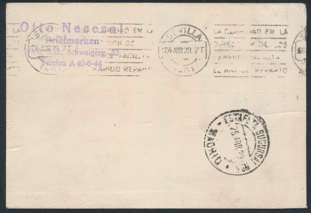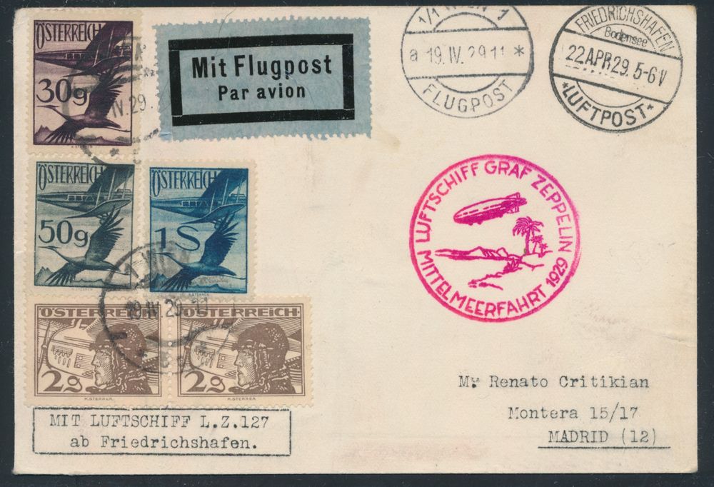 4331 image19.4.1929 N° 20Ia (Mi. Zeppelin Specialised), LZ 127 Mediterranean Flight - Seville drop-off postcard sent from Vienna, Austria and addressed to Madrid, Spain, franked 1S84g with Austian airmail stamps and then forwarded to Friedrichshafen where it received the departure c.d.s. dated 22.4.1929, alongside the zeppelin flight cachet in lilac-red, Sevilla transit and Madrid arrival postmarks on the back, vf(Image 1) (Image 2)