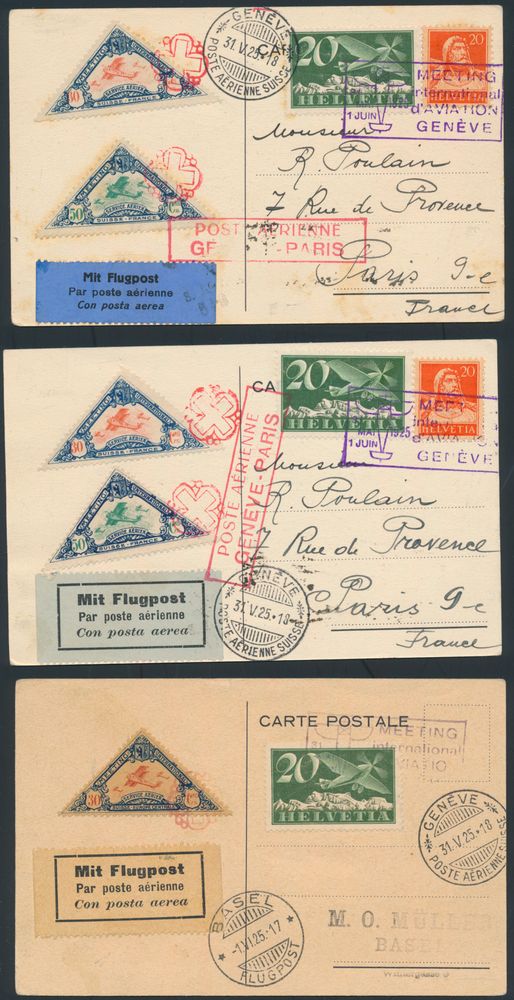 4338 image31.5.1925 Geneva International Aviation Meeting lot of 3 official postcards each showing one or two triangular vignettes issued for the occasion (SBK nos. 13-15, cat. value CHF 50 on cover each), in addition to the normal frankings tied by the special flight cachet, one card sent to Basel and the other two sent to Paris, vf(Image 1) (Image 2)