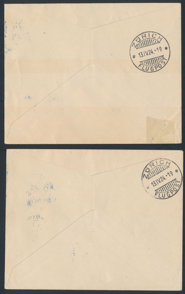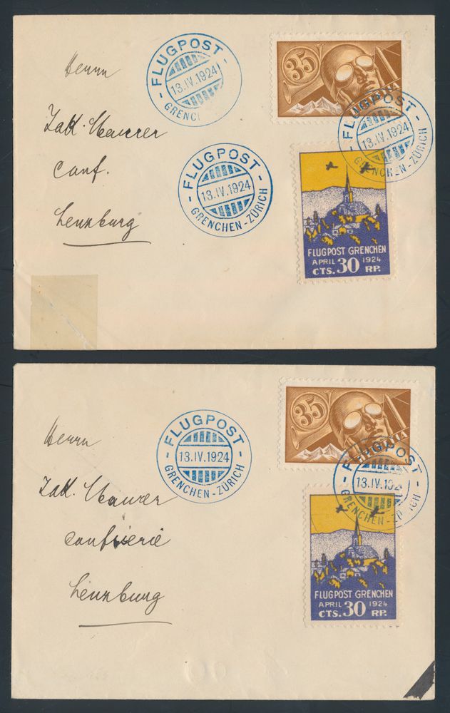 4335 image13.4.1924 Flugtag Grenchen two covers both franked with the vignette issued for the occasion (SBK 7I, cat. value CHF 60 on cover) alongside a 35rp airmail stamp (SBK F6, cat. value CHF 120 on cover), tied by special flight postmark in blue, Zürich arrival c.d.s. on the back, minor flaws but overall fine aspect, vf(Image 1) (Image 2)