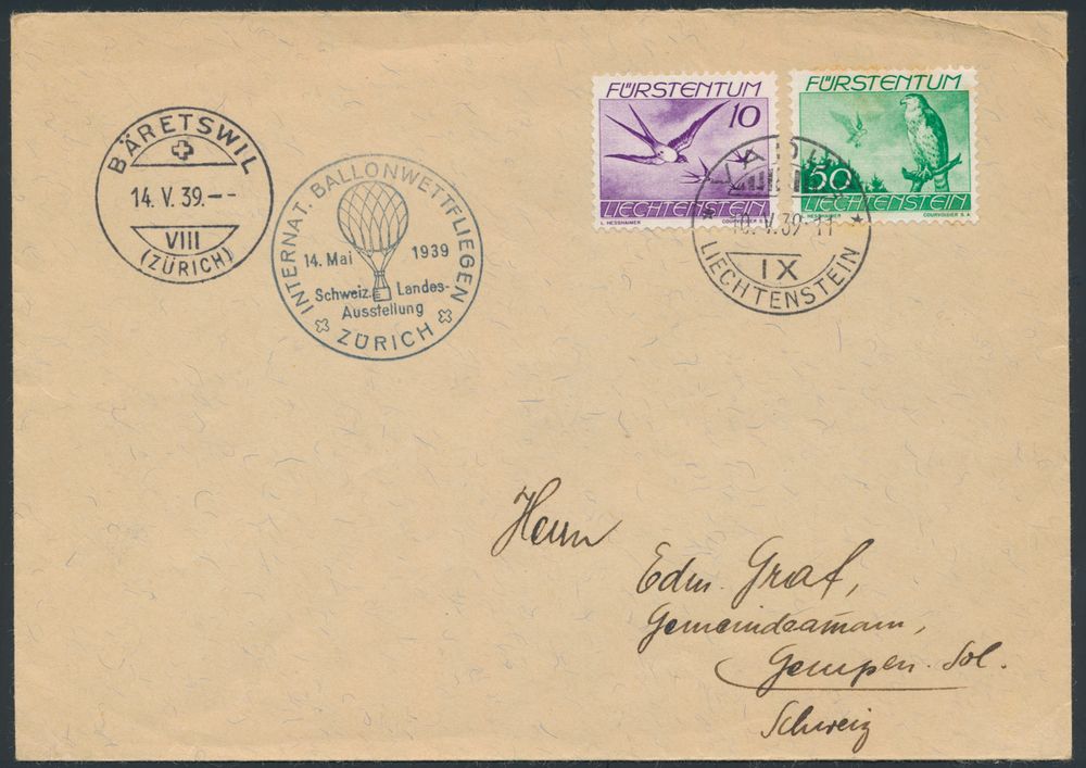 4321 image14.5.1939 N° 84 (Mi. Zeppelin Specialised), International Weather Balloon Flight Zürich - Bäretswill cover sent from Vaduz to Gempen, Switzerland, bearing 10rp + 50rp airmail stamps, special flight cachet and landing postmark both alongside on the front, vf(Image 1) (Image 2)