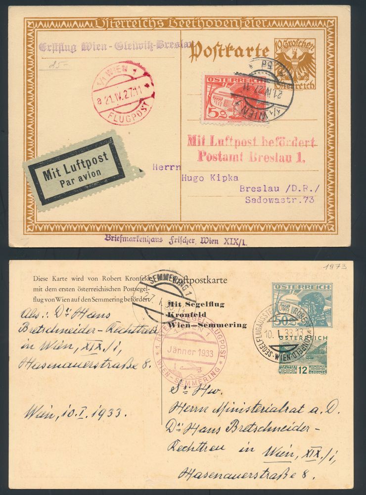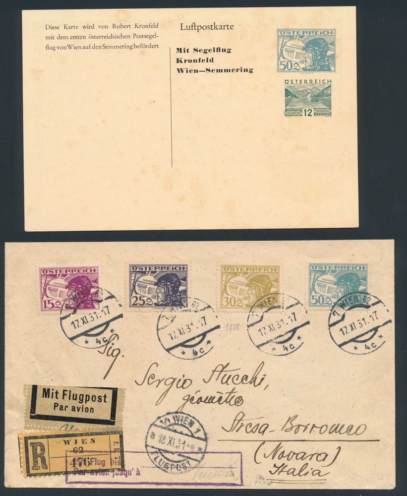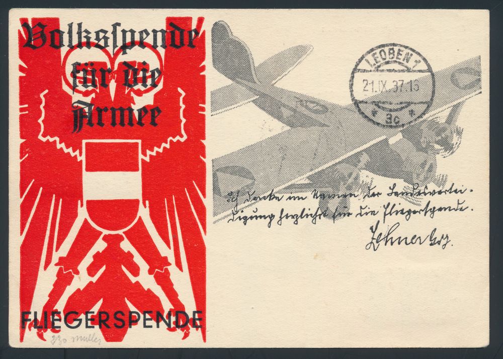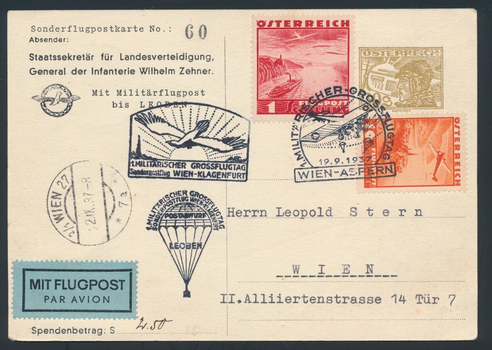 4334 image19.9.1937 Military Aviation Day - Wien-Klagenfurt Special Postal Flight - Leoben drop-off illustrated 30g postcard (numbered, this being no. 60) addressed to Vienna and up-rated with 1S and 10g airmail stamps, all tied by special decorative postmark, with additional flight cachets alongside, as well as regular arrival c.d.s., vf(Image 1) (Image 2)