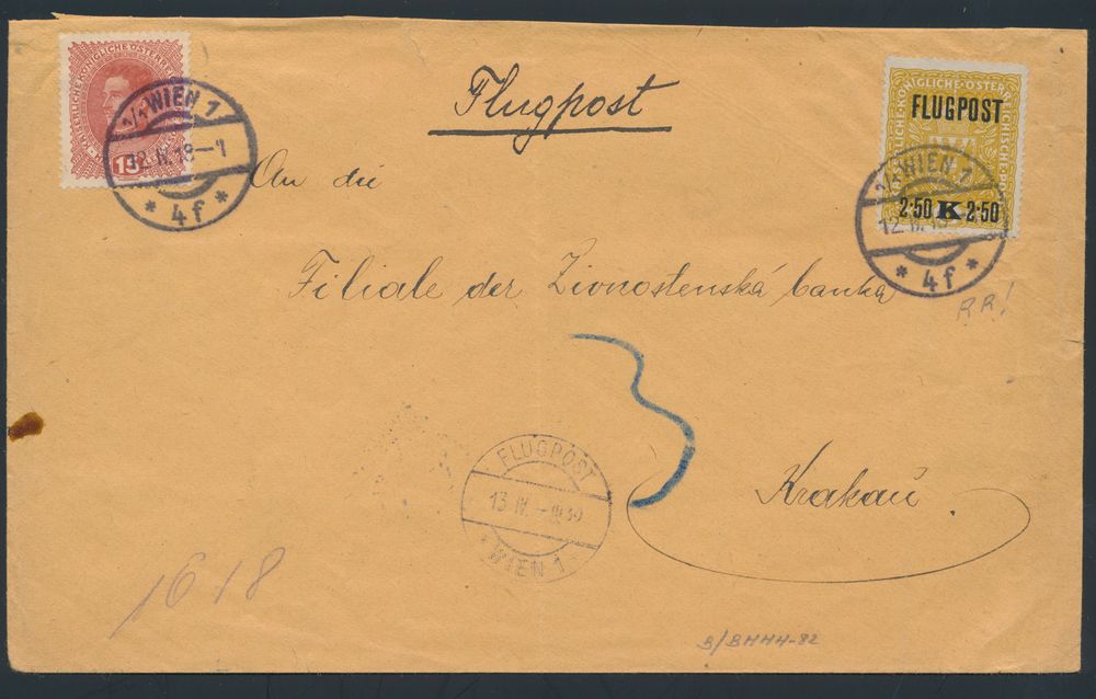 4328 image12.4.1918 airmail cover sent from Vienna to Krakow, Poland and bearing a 2.50kr on 3kr grey paper airmail stamp (Michel 226xIA, cat. value on cover €130) as well as a 15pf regular stamp, arrival postmark on back, vf(Image 1) (Image 2)