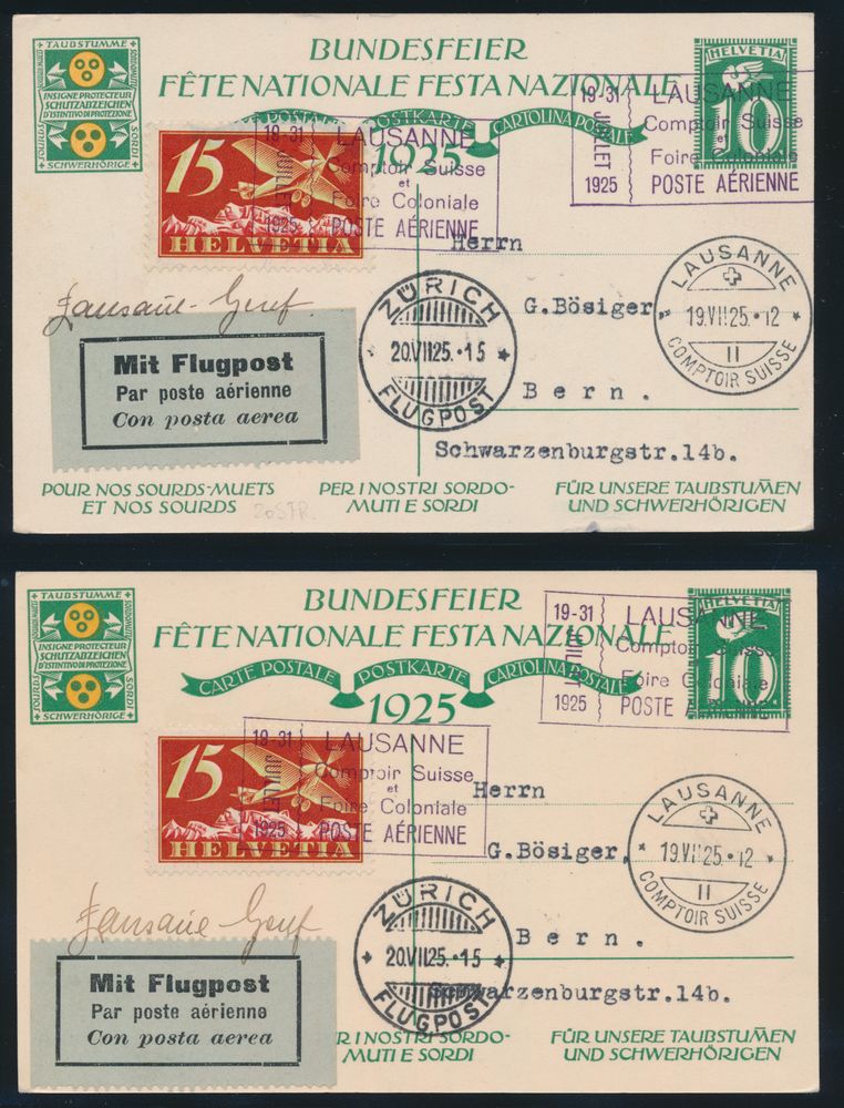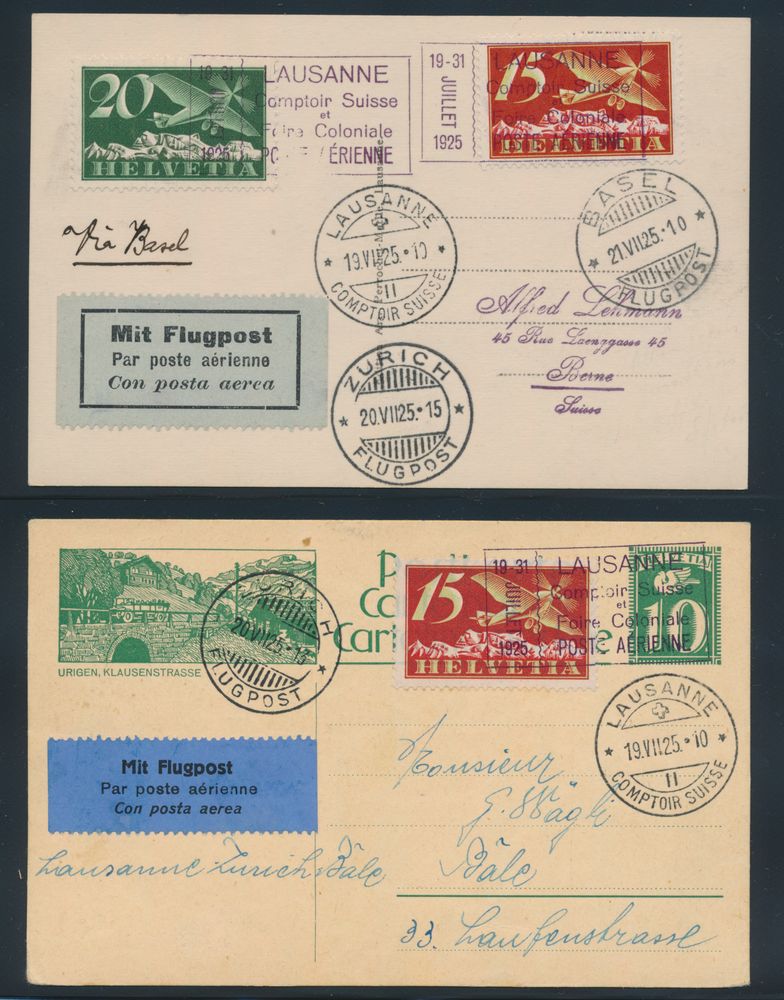 4337 image19.7.1925 Lausanne Colonial Fair lot of 4 postcards sent by airmail within Switzerland, including two different National Day illustrated cards and one photo postcard from the Exhibition, each franking is tied by the special cachet "Lausanne Comptoir Suisse et Foire Coloniale Poste Aerienne", vf(Image 1) (Image 2)