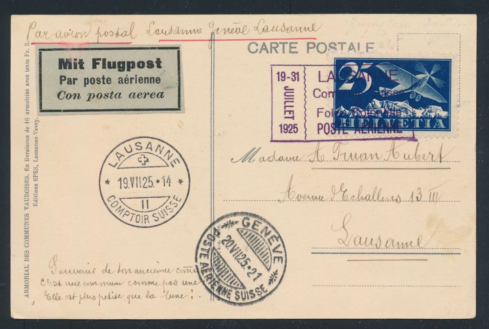 4336 image19.7.1925 Lausanne Colonial Fair illustrated postcard travelled on the Lausanne-Geneva-Lausanne return flight, franked with a 25rp stamp (SBK F5) tied by special cachet "Lausanne Comptoir Suisse et Foire Coloniale Poste Aerienne"(Image 1) (Image 2)