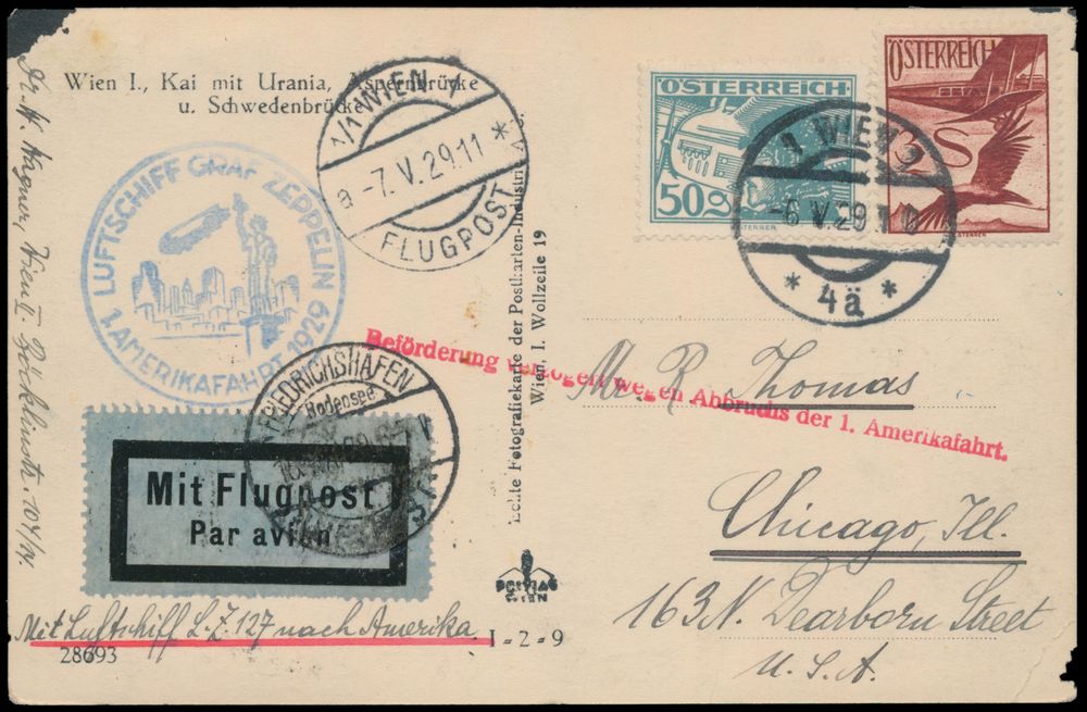 4332 image6.5.1929 N° 23 (Mi. Zeppelin Specialised), LZ 127 Amerikafahrt photo postcard sent from Vienna, Austria to be flown by airship to Chicago, franked on departure for 3S50g with two Austrian airmail stamps, Friedrichshafen departure c.d.s. dated 16.5.1929 as well as zeppelin flight cachet in blue and single-line handstamp in red applied when the airship had to do an emergency landing in Cuers (thus delaying the delivery), a rather uncommon card, vf(Image 1) (Image 2)