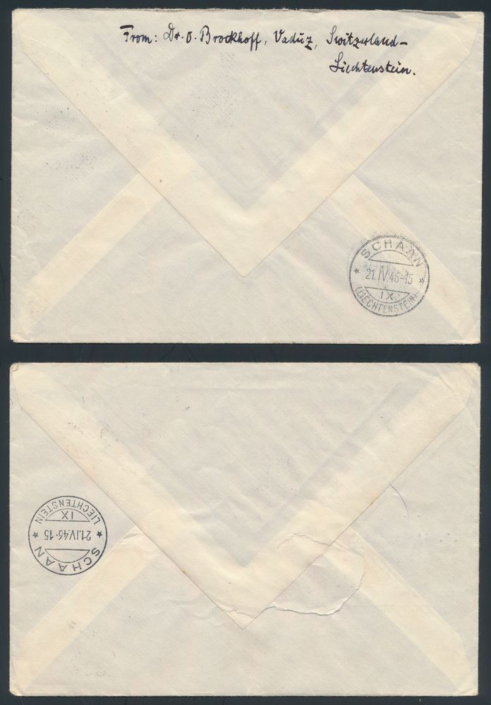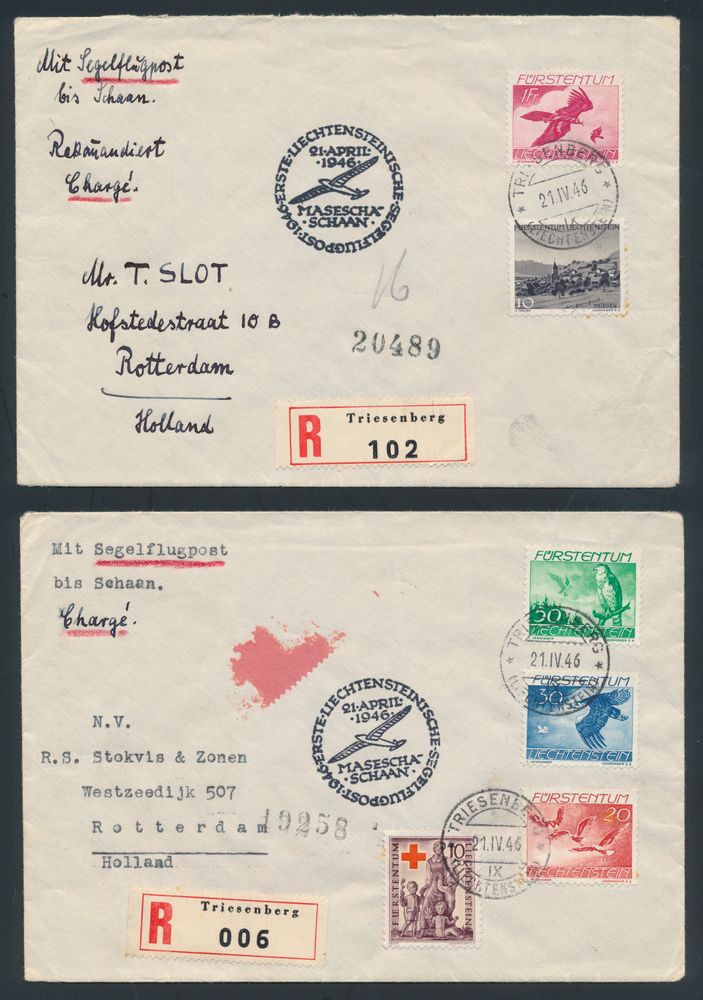 4324 image21.4.1946 N° 99 (Mi. Zeppelin Specialised), First Liechtenstein Glider Mail Flight Masescha-Schaan two registered covers sent from Triesenberg to Rotterdam, Netherlands, each franked for 1fr10rp and each showing special flight cachets on the front and Schaan landing postmarks on the back, minor faults but overall very fine, vf(Image 1) (Image 2)