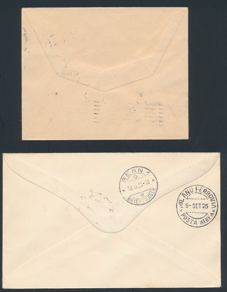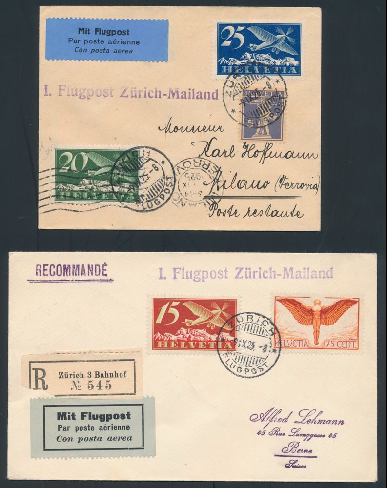 4340 image9.9.1925 Zürich - Milano First Flight two covers one sent to Milano and the other one sent registered to Bern, the latter franked with the 75rp airmail stamp (SBK F11, cat. value CHF 150 on cover), both with "I. Flugpost Züruch-Mailand" single-line handstamp in violet, vf(Image 1) (Image 2)