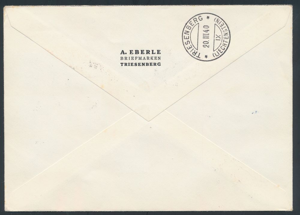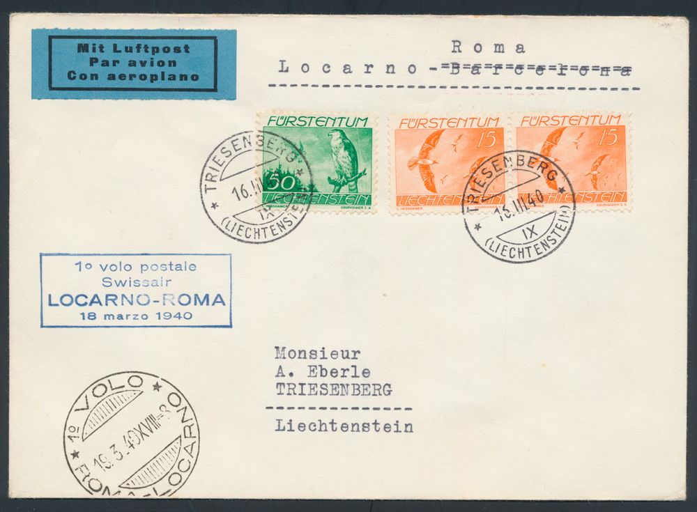 4322 image16.3.1940 N° 92 (Mi. Zeppelin Specialised), Locarno-Roma Swissair First Flight cover sent to and from Triesenberg, 80rp airmail franking, special flight cachet in blue and Rome landing c.d.s. on the front, and Triesenberg final arrival c.d.s. on the back, vf(Image 1) (Image 2)