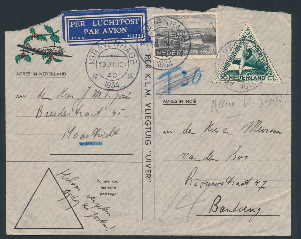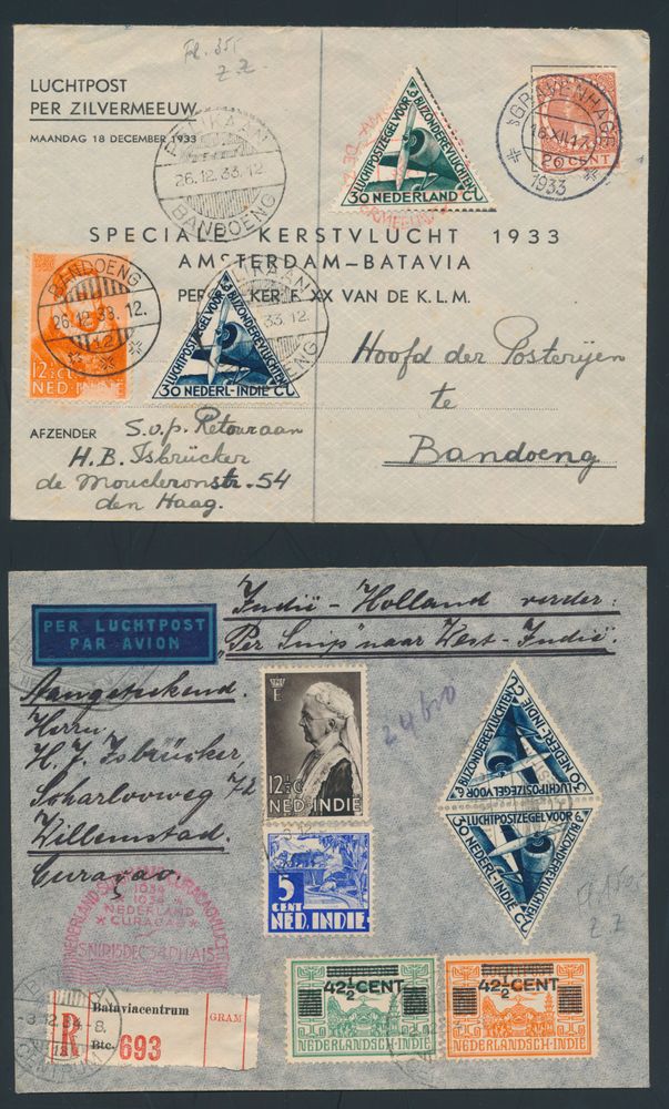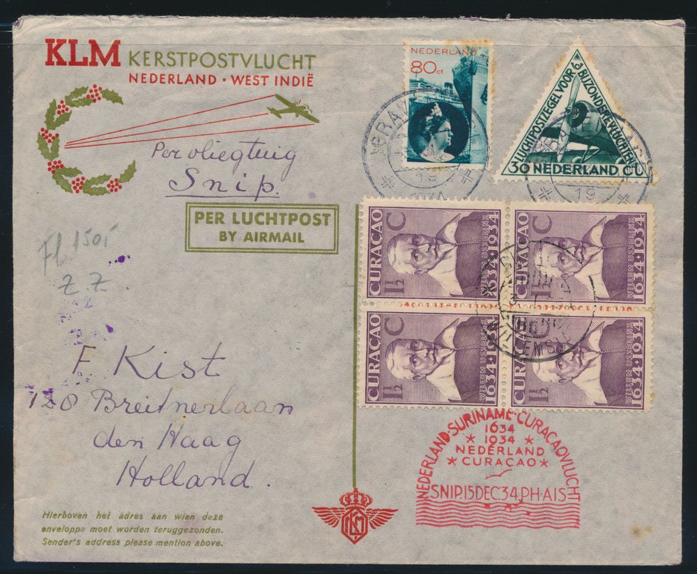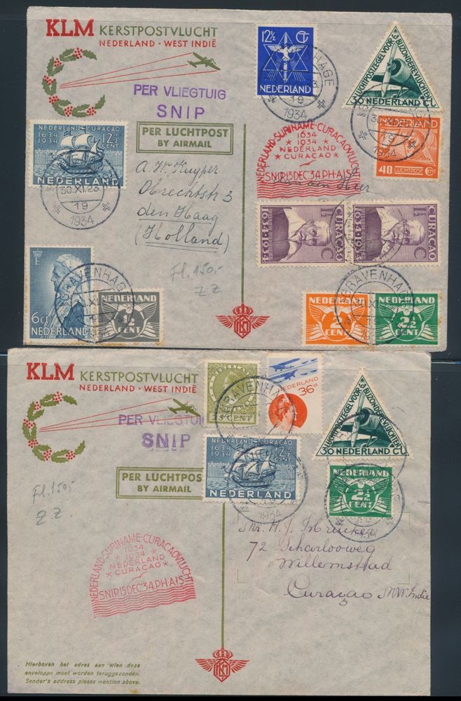 4327 image15.12.1934 Netherlands - Suriname - Curacao Flight by SNIP aircraft lot of 3 covers carried on the flight, two of which show mixed Netherlands - Curacao frankings, each with special flight cachet in red, vf(Image 1) (Image 2)