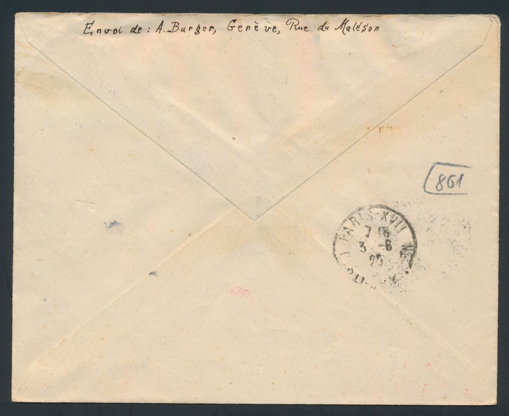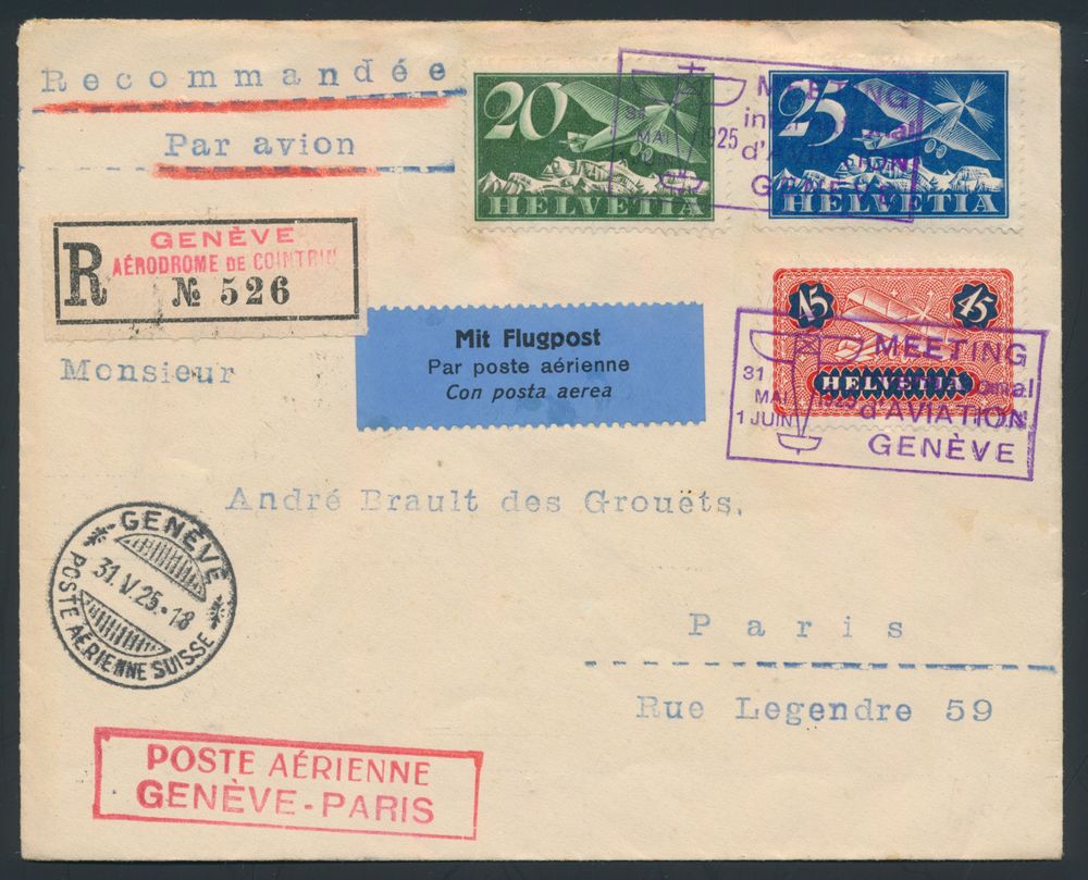 4339 image31.5.1925 Geneva International Aviation Meeting registered cover sent to Paris and bearing a 90rp franking cancelled with the special flight cachet in violet, regular departure c.d.s. alongside on the front and arrival c.d.s. on the back, vf(Image 1) (Image 2)
