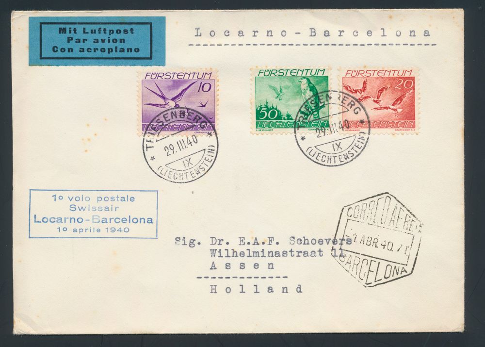 4323 image29.3.1940 N° 93 (Mi. Zeppelin Specialised), Locarno-Barcelona Swissair First Flight cover sent from Triesenberg to Assen, Netherlands, franked with airmail stamps totalling 80rp, hexagonal Barcelona landing postmark on the front, vf(Image 1) (Image 2)