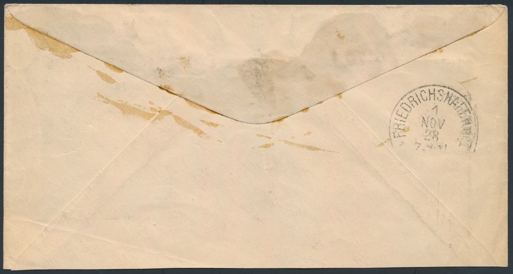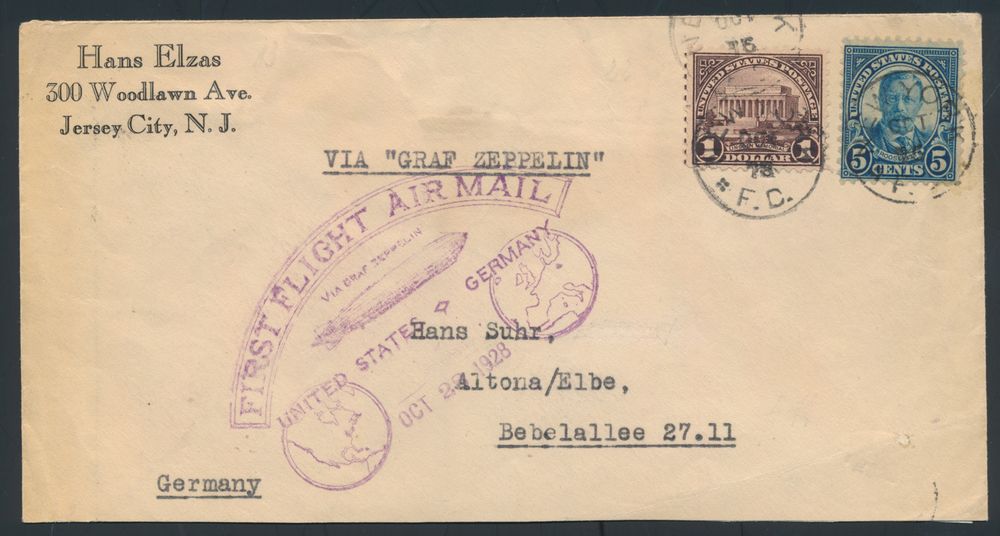 4376 image16.10.1928 N° 8Ac (Mi. Zeppelin Specialised), LZ 127 Amerikafahrt cover sent from New York to Altona, Germany and franked with $1 + 5c stamps, zeppelin flight cachet "First Flight Air Mail" in violet alongside, Friedrichshafen arrival c.d.s. on the back, vf(Image 1) (Image 2)