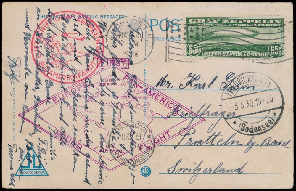 4378 image30.5.1930 N° 68Ja (Mi. Zeppelin Specialised), LZ 127 USA Flight illustrated postcard sent from Lakehurst, NJ to Pratteln, Switzerland and franked with a 65c US zeppelin stamp (Michel 326, cat. value €240 on cover) tied by regular machine cancel, "First Europe Pan-America Round Flight" special cachet in violet and also zeppelin South America Flight cachet in red alongside, as well as Friedrichshafen arrival postmarks, uncommon, vf(Image 1) (Image 2)