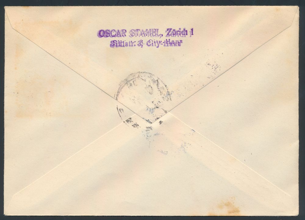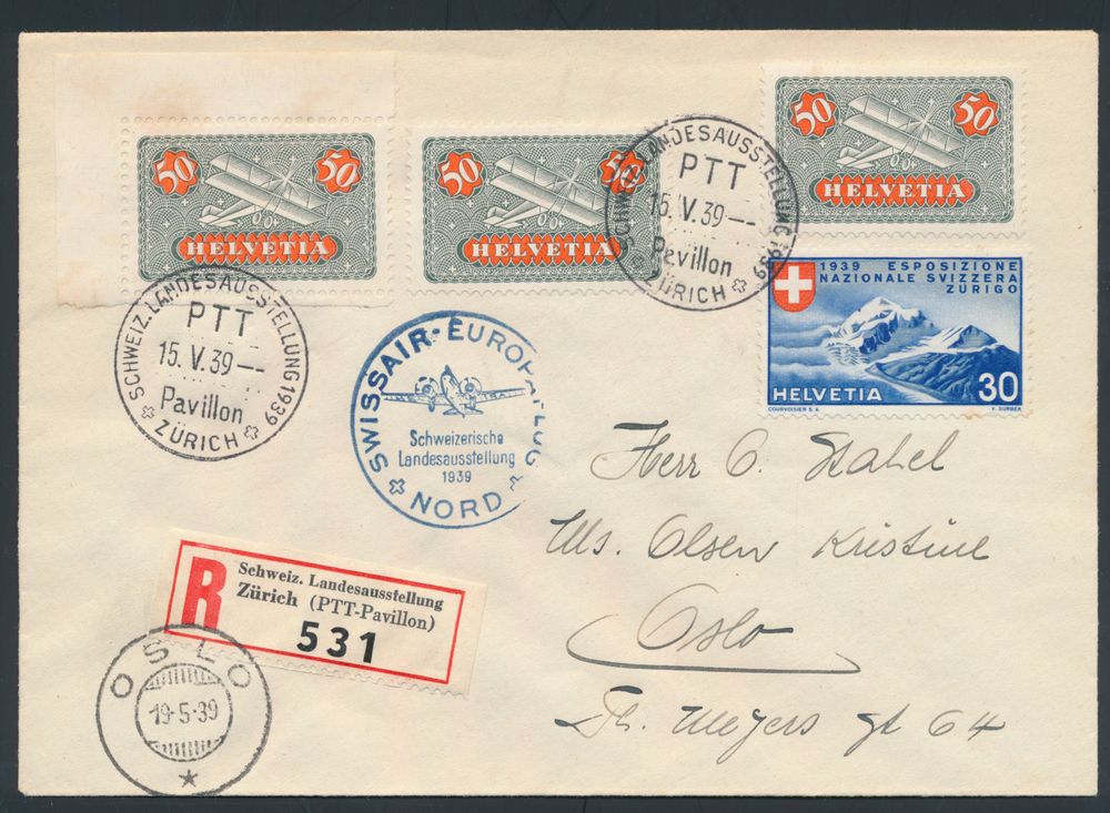 4365 image29.4.1939 SWISSAIR Europa Flight on the occasion of the Swiss National Exhibition of 1939 registered cover sent from Zürich to Oslo, Norway and franked for 1fr80rp, stamps cancelled in Zürich, special flight cachet alongside in blue, arrival c.d.s. on the front, vf(Image 1) (Image 2)