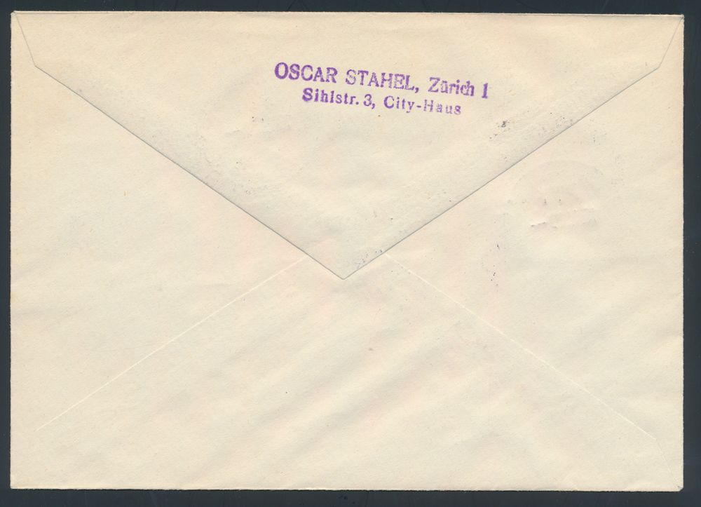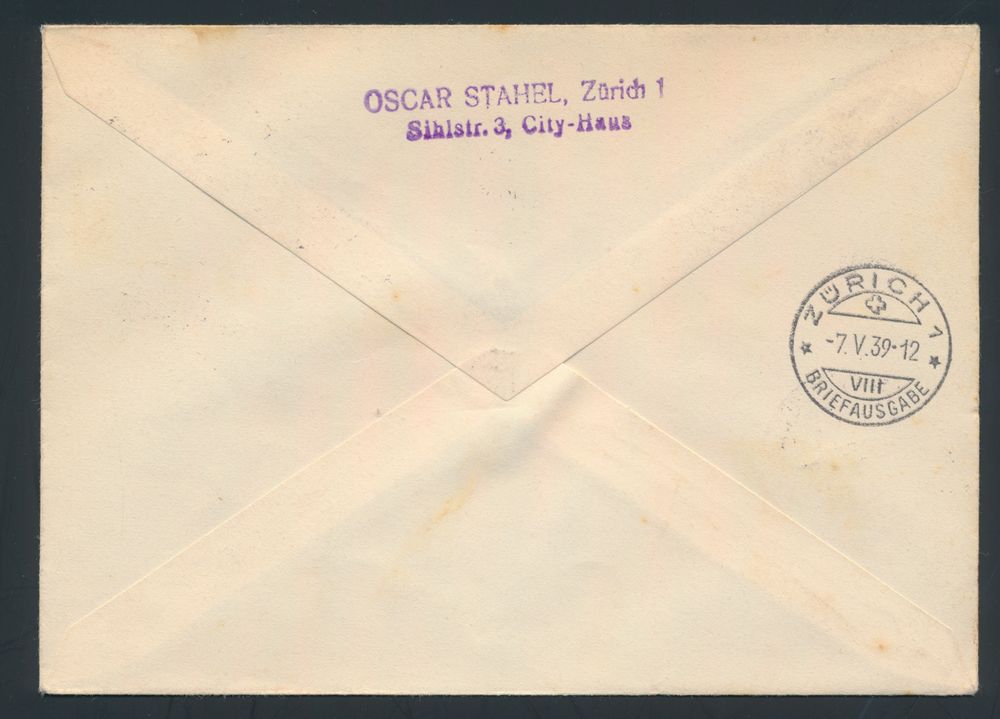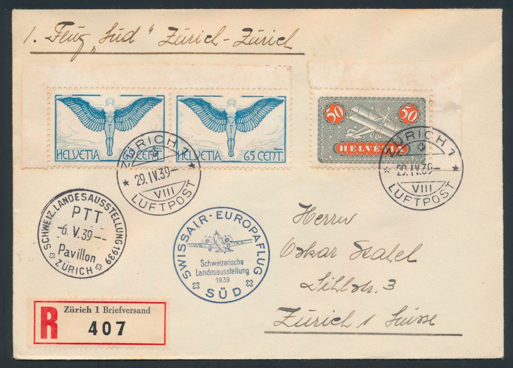 4366 image29.4.1939 SWISSAIR Europa Flight on the occasion of the Swiss National Exhibition of 1939 registered cover sent on the roundtrip from Zürich and back, franked for 1fr80rp, special flight cachet alongside in blue, as wel as an exhibition postmark, arrival c.d.s. dated 7.5 on the back, vf/f(Image 1) (Image 2)