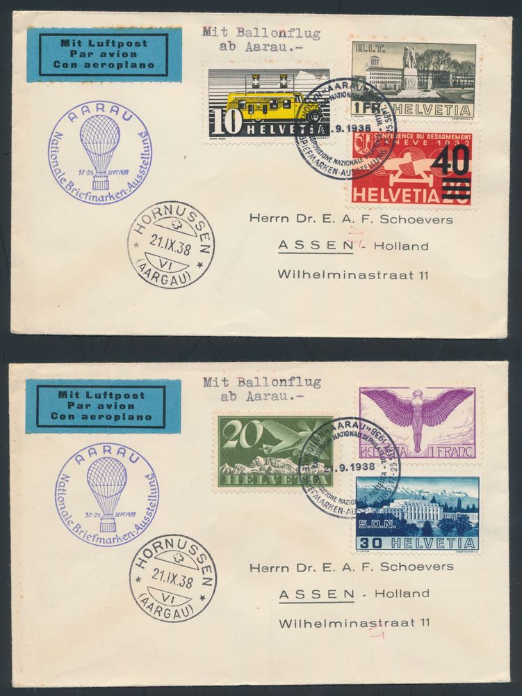4361 image21.9.1938 Aarau Stamp Exhibition Balloon Post two covers sent to Assen, Netherlands and displaying colourful 1.50fr frankings, both tied by special exhibition postmark, flight cachet in blue alongside, vf(Image 1) (Image 2)